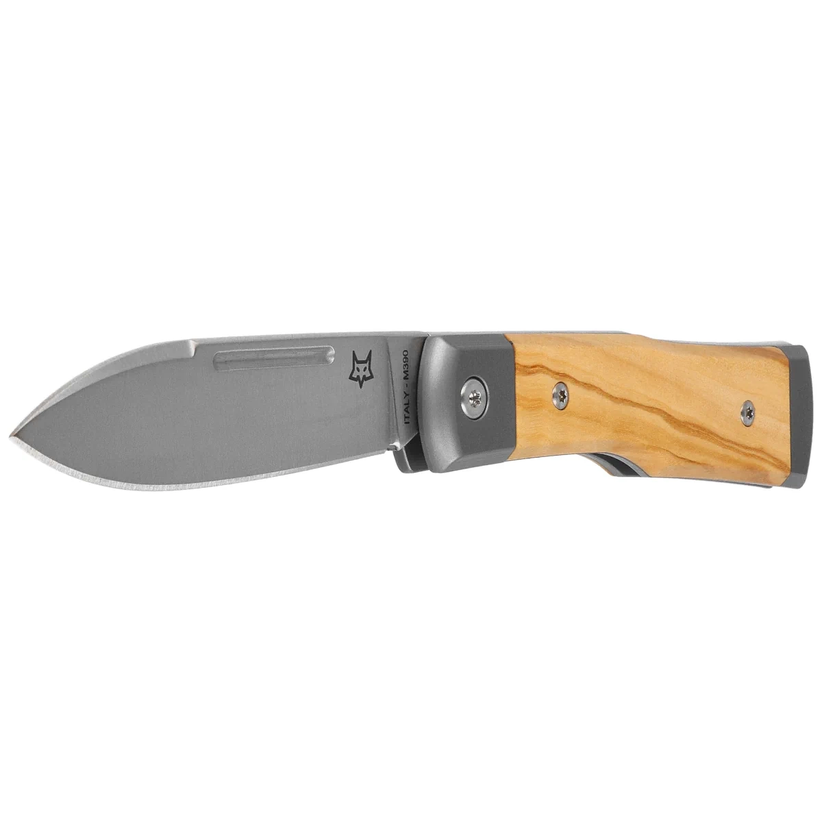 Gunstock Olive Wood/Titanium, Satin is a contemporary reinterpretation of traditional EDC pocket knives, where Italian design meets precision manufacturing technology. The gently curved line of the Handle, typical of Gunstock design , improves the ergonomics of the grip and gives the design a timeless, collectible character. This model is designed for those who appreciate the classic form, but do not want to give up modern materials and technical precision. Blade made of Böhler M390powder steel, known for its exceptional sharpness retention, wear resistance and corrosion resistance - making it one of the best options for everyday use. The spear point profile with an elegant satin finish provides a balance between precision and versatility, while the classic nail nick allows for comfortable opening in any situation. The slipjoint mechanism, devoid of the classic locking mechanism, offers smooth operation and safe use, even in jurisdictions with restrictive knife ownership laws. Handle grips combine titanium bolsters with olive wood grips, offering exceptional visual contrast and natural aesthetics. The titanium adds rigidity and lightness to the construction , while the olive provides warmth, character and a unique grain, making each piece one-of-a-kind. Ergonomic profiling and a high level of detail finish highlight the high quality typical of the Fox Knives brand.