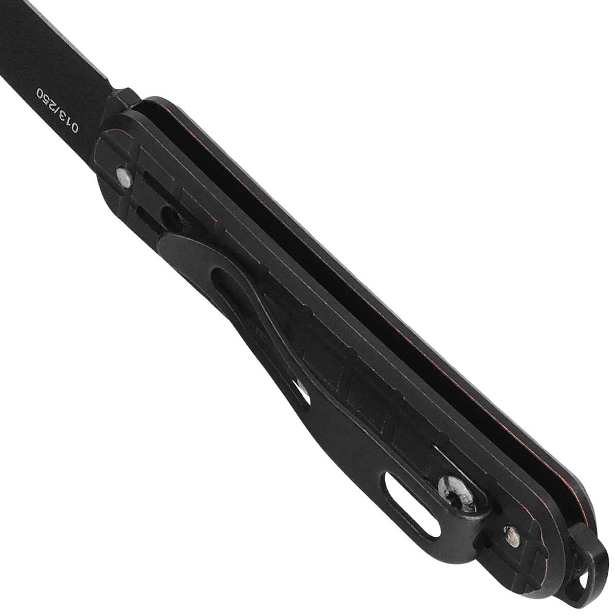 Handle - grips made of temperature and mechanical damage resistant copper. Covered with black PVD coating and rubbed on the edges, it gives a great visual effect. The distinctive texture of the Handle imitating the surface of a fragmentation grenade(Frag Pattern) in addition to visual value makes the knife does not slip in the hand during use. The simple shape fits perfectly in any hand. The two-position clip allows the knife to be carried in tip-up or tip-down position. In the back, a wide “eye” for threading a belay or decorative cord.