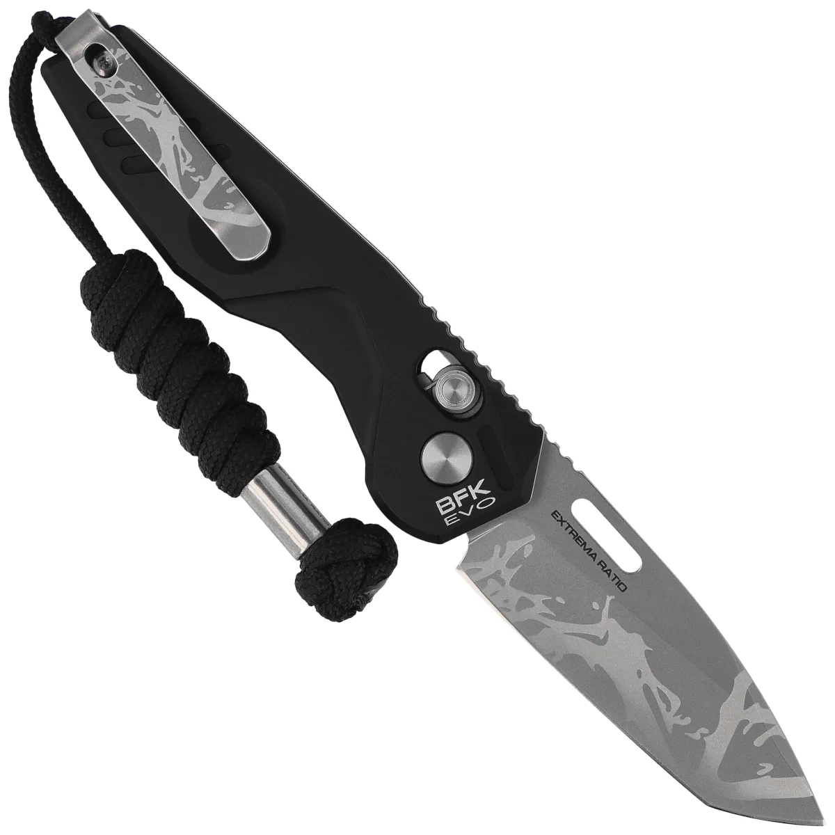 At the center of the set is the BFK EVO LE folder , produced in a quantity of only 500 pieces. The knife has an individual serial number (here: 253/500), and its design is based on the recognizable Basic Folder Knife line. Blade made of Nitrogen steel has been stonewashed finished with a laser camouflage pattern, giving each piece a unique look. The Axis Lock mechanism ensures reliable locking and smooth operation of the blade, while the anodized aluminum grips guarantee durability and comfort. The whole set is completed with a deep carry clip and a paracord with a metal tip.