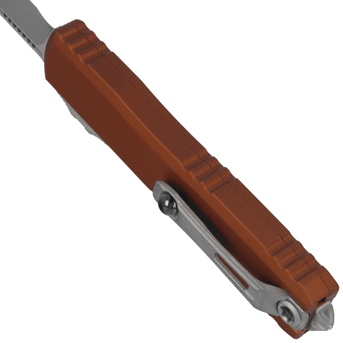 Handle - made with excellent precision in 3D technology on CNC milling machines, from Mil-Spec hard-coated aluminum 6061-T6. The surface texture of the Handle makes the knife non-slip in the hand during use. There are notches (jimping) on the back and bottom of the handle for a more secure grip. The slim profile and milled two-position (right/left) solid deep-carry clip allow the knife to be carried discreetly in a pocket, in tip-down (blade tip down) position. The clip bears the Microtech logo, serial number and production date. The Handle is finished with a glass breaker, a solid steel triangle into which a tungsten carbide ball has been pressed. It also features a hole for interweaving a decorative cord.