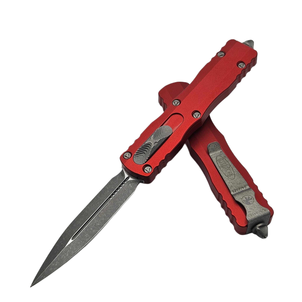 Dirac Delta D/E Red Aluminum, Apocalyptic is an enlarged OTF automatic knife from the Dirac series. Operating in D/A mode , it features a hellishly fast blade extension mechanism. Slider button on the side of the handle. 100% made and assembled in the USA. Designed by Anthony Marfione, knifemaker and owner of Microtech Knives.