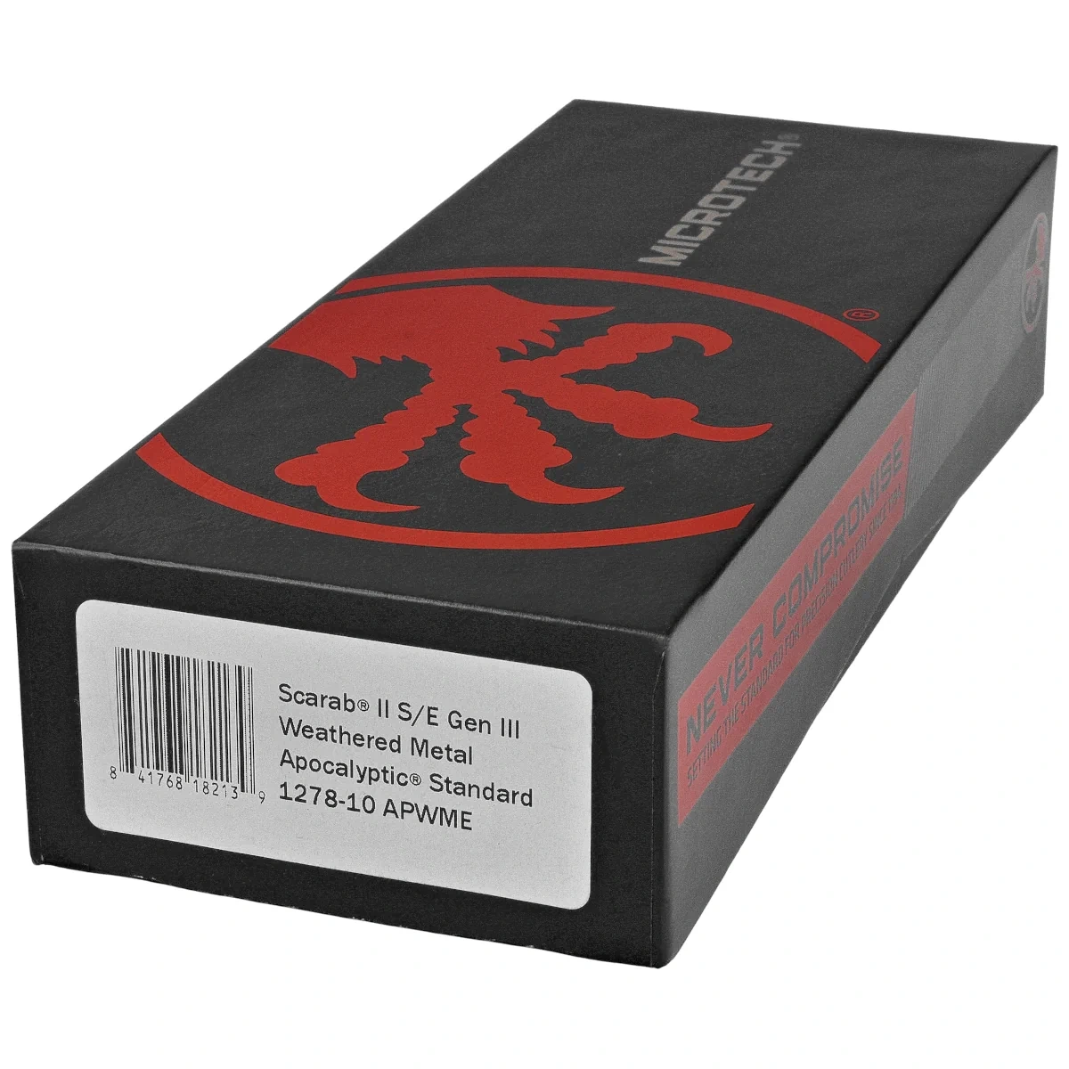 Scarab II Gen III S/E Weathered Metal Aluminum, Apocalyptic is the pinnacle of excellence in automatic tactical knives, taking inspiration from the original design of the Microtech Ultratech. Built to withstand the toughest conditions, the new Scarab II is the ultimate choice for heavy use. While retaining the styling features of its predecessor, it sets a new standard for OTF (Out The Front) technology.