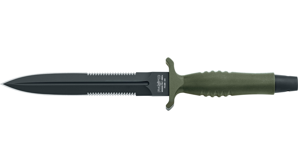 Blade - extremely slender with a Dagger shape with a double-edged symmetrical blade. The blade was coated with a black, non-reflective coating Top Shield®. The blade was derived with a Flat grind for excellent cutting and especially penetration properties. On both sides closer to the Handle a sawtooth blade with fine serrations. At the base of the blade double finger guard crossguard on both sides to protect the hand from slipping on the blade.