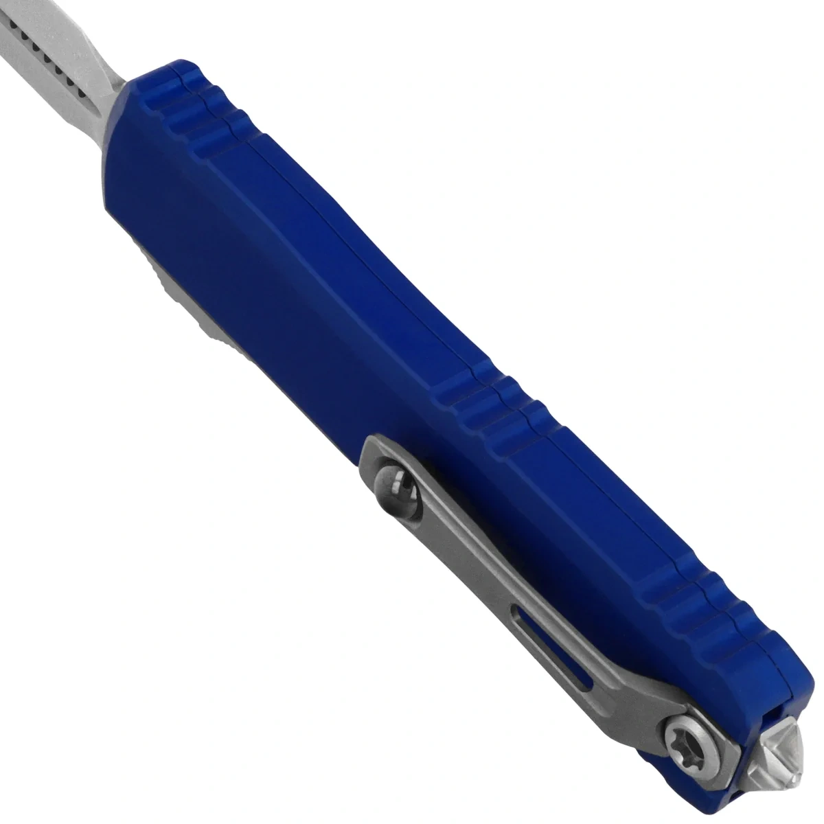 Ultratech Gen IV D/E Navy Blue Aluminum, Stonewashed is a full-size OTF (Out The Front) automatic knife from Ultratech. The fourth generation is distinguished by a number of improvements such as; Crud Kutter™, Dual-Fuel Drive Train™. The Handle was also redesigned, equipping it with solutions known from other models. Working in D/A (Double Action) mode, it allows the blade to be instantly extended and retracted with a single thumb movement. The design by Tony Marfione, owner of Microtech Knives, combines modern design with the highest quality workmanship.