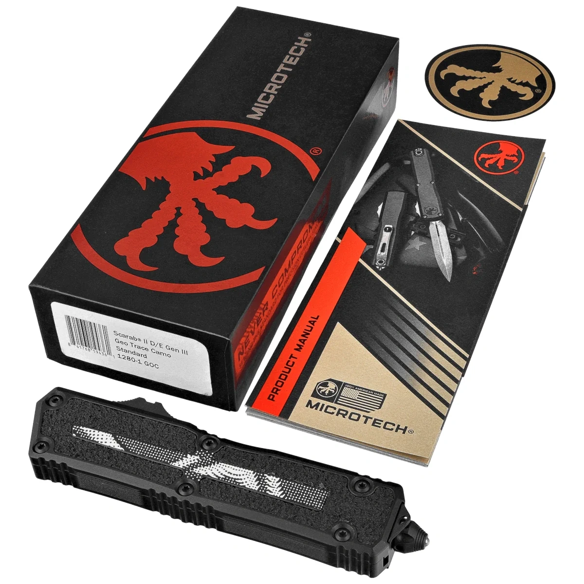 Microtech Scarab II Gen III D/E OTF Knife Geo Trace Camo Aluminum, Geo Trace Camo M390MK by Tony Marfione (1280-1GOC)