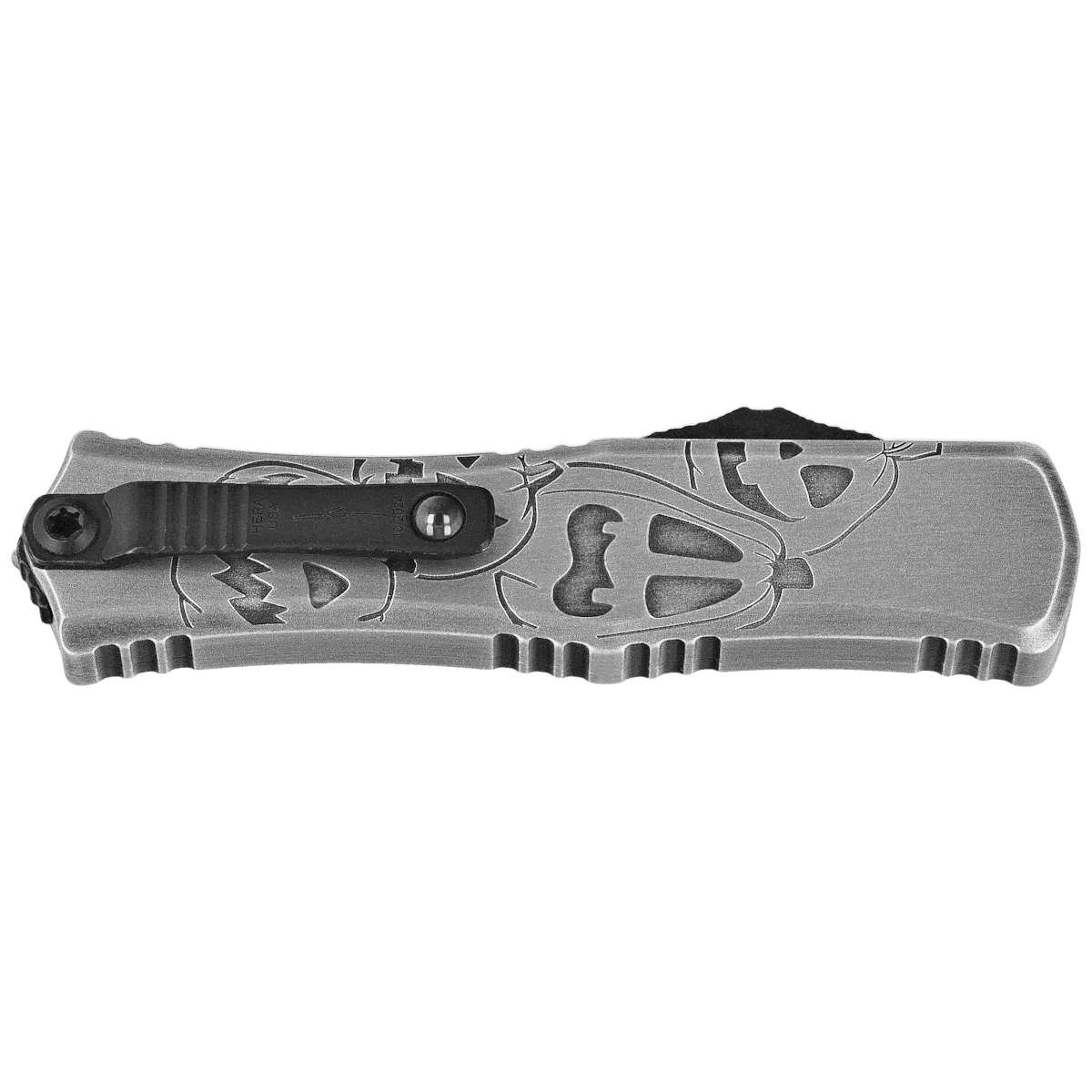 Hera II Mini D/E Jack-O-Lantern Aluminum, Black Apocalyptic one of the most versatile OTF (Out The Front) automatic knives. Modeled on the iconic Troodon model , it is a link between EDC models and strictly tactical designs . An automatic of above-average strength with a mechanism operating in D/A (Double Action) mode, ensuring fast, strong and secure blade ejection and retraction. The model is distinguished by the excellent fit of the parts and the highest quality finish. The design is by Anthony Marfione, renowned knifemaker and owner of Microtech Knives.