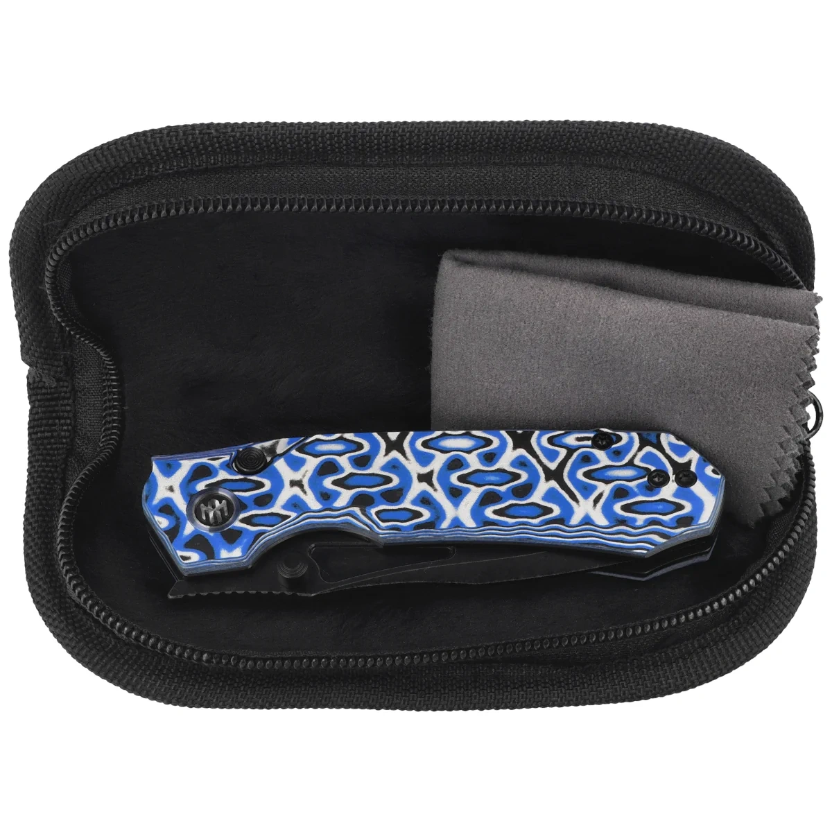 Handle grips - G10 (pressure-pressed fiberglass with synthetic resin), textured for improved grip confidence, bolted to the knife' s steel frame. The massive backspacer to which the grips are attached guarantees the rigidity and strength of the entire structure. A single-position (right) steel deep-carry clip allows you to carry the knife discreetly in your pocket in tip-up position (blade tip up). The decorative ring around the pivot, the so-called pivot collar, is made of blue anodized titanium. The hidden recess of the backspacer contains a place to thread a safety or decorative cord.