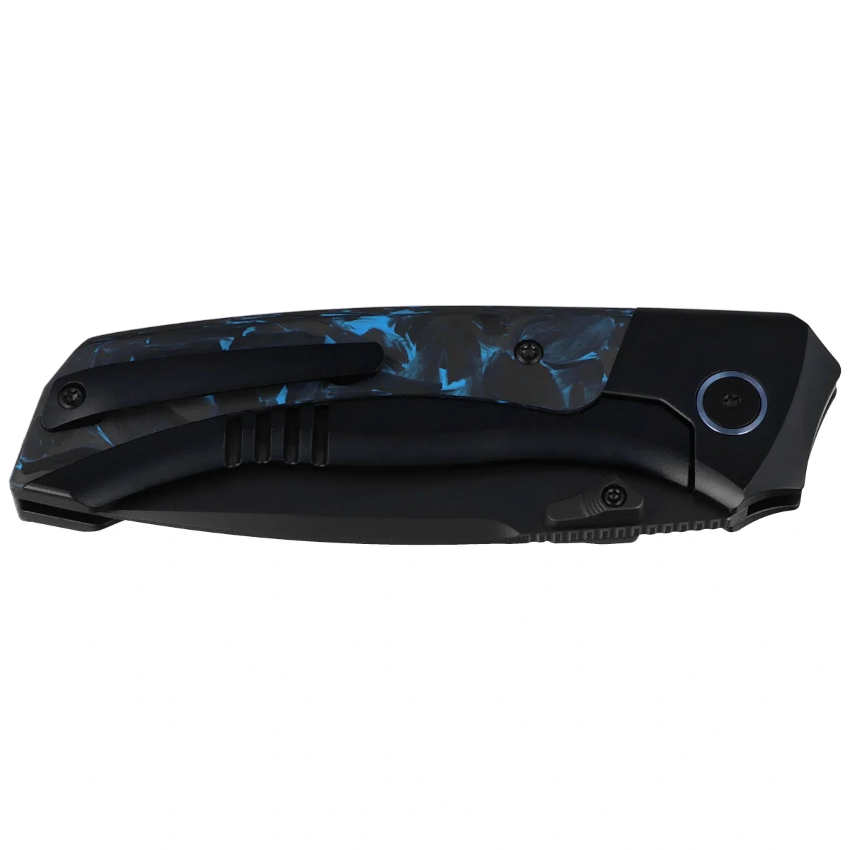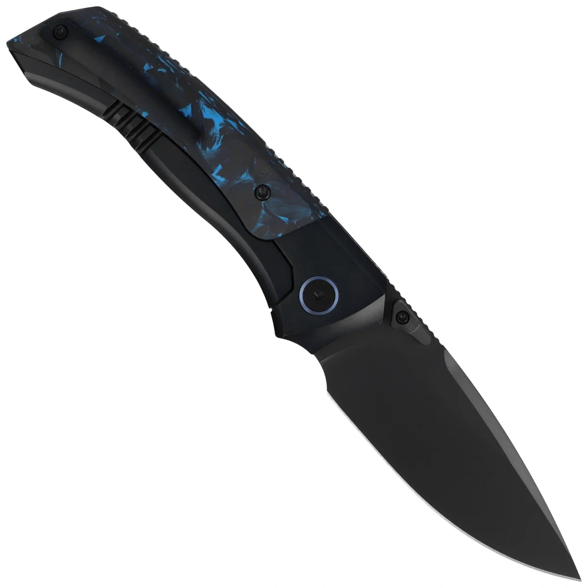 • RT-Steed Black Titanium/Black-Blue Carbon Fiber, Black DLC is a modern premium EDC folding knife that combines refined mechanics, advanced materials and a sleek, technical form designed with conscious use in mind.