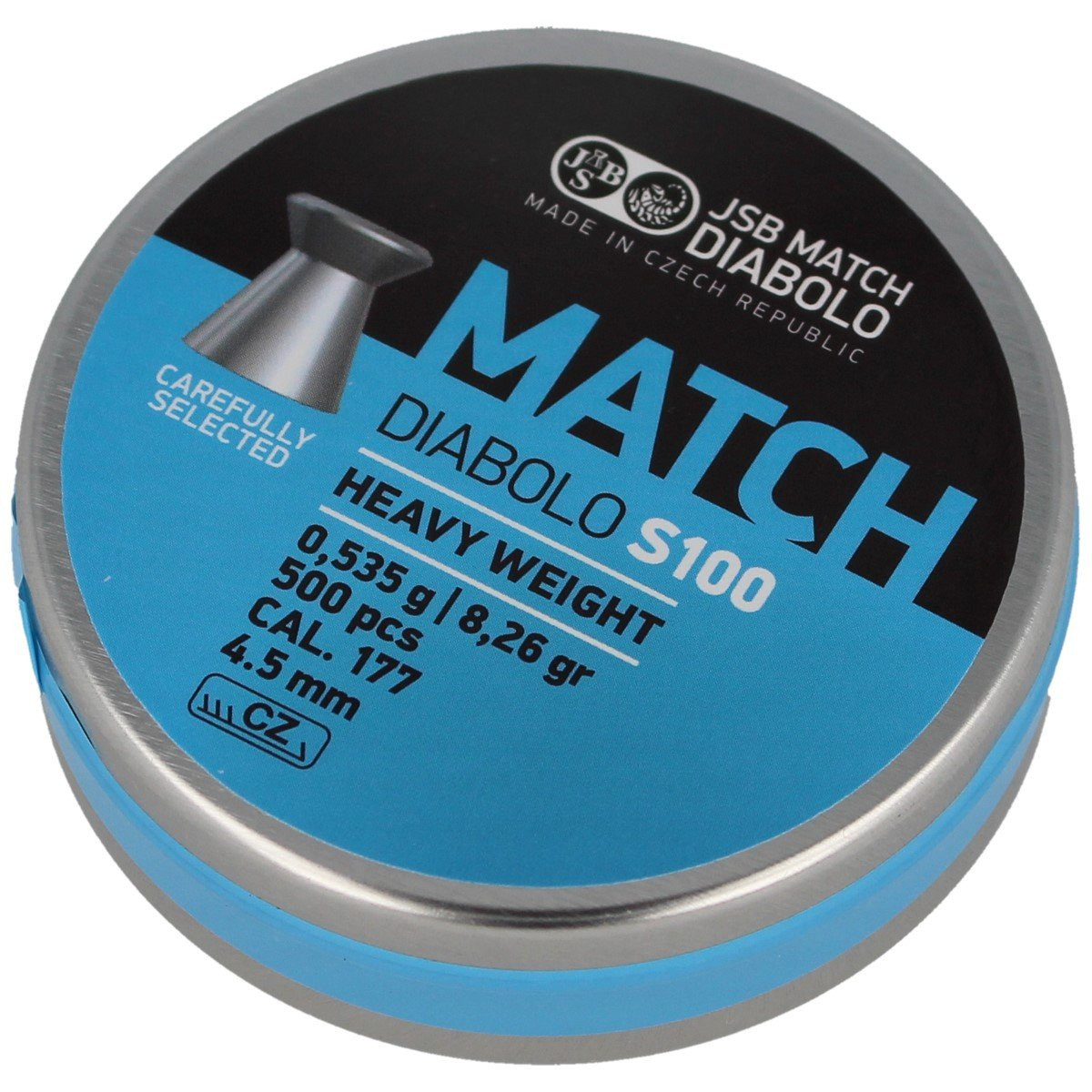 - Blue Match Diabolo S100. Heavy Weight 0.535g najcięższy karabinowy tarczowy śrut JSB z płaskim czołem w kal 4.5 mm. Używany przez Mistrza Świata ISSF 2010 włoskiego strzelca Niccolo Campriani. Idealnie płaska głowica gładki kielich bez moletowania. 500szt