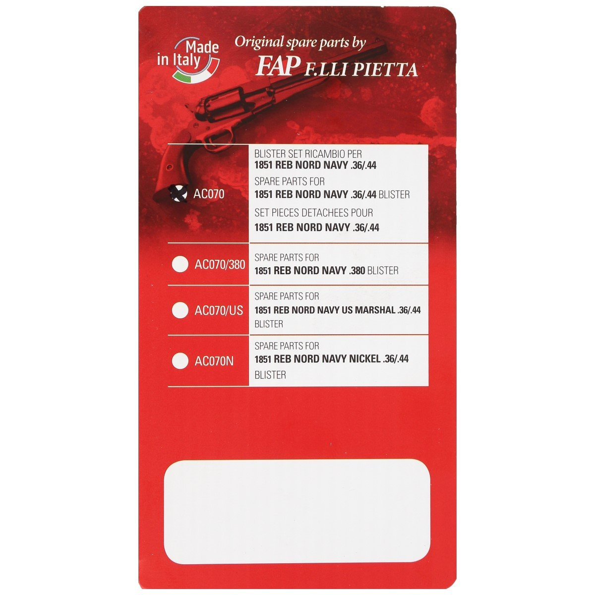 - AC070 (serwis), zestaw niezbędnych części eksploatacyjnych do kapiszonowych rewolwerów czarnoprochowych 1851 Colt Reb Nord Navy .36/.44 cal firmy Pietta Arms.