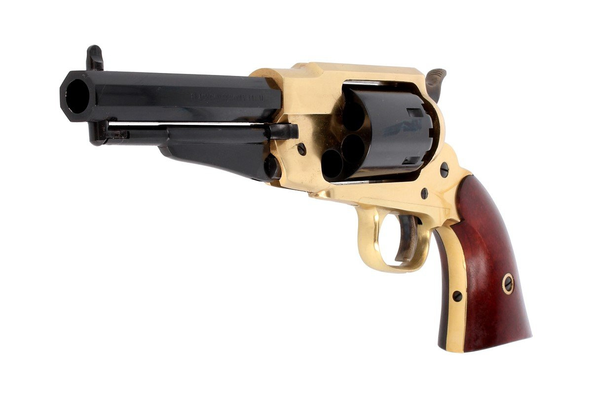 Remington 1858 Texas Sheriff .44, sześciostrzałowy kapiszonowy rewolwer czarnoprochowy Remington w kalibrze .44, ładowany odprzodowo z ramą mosiężną zamkniętą.