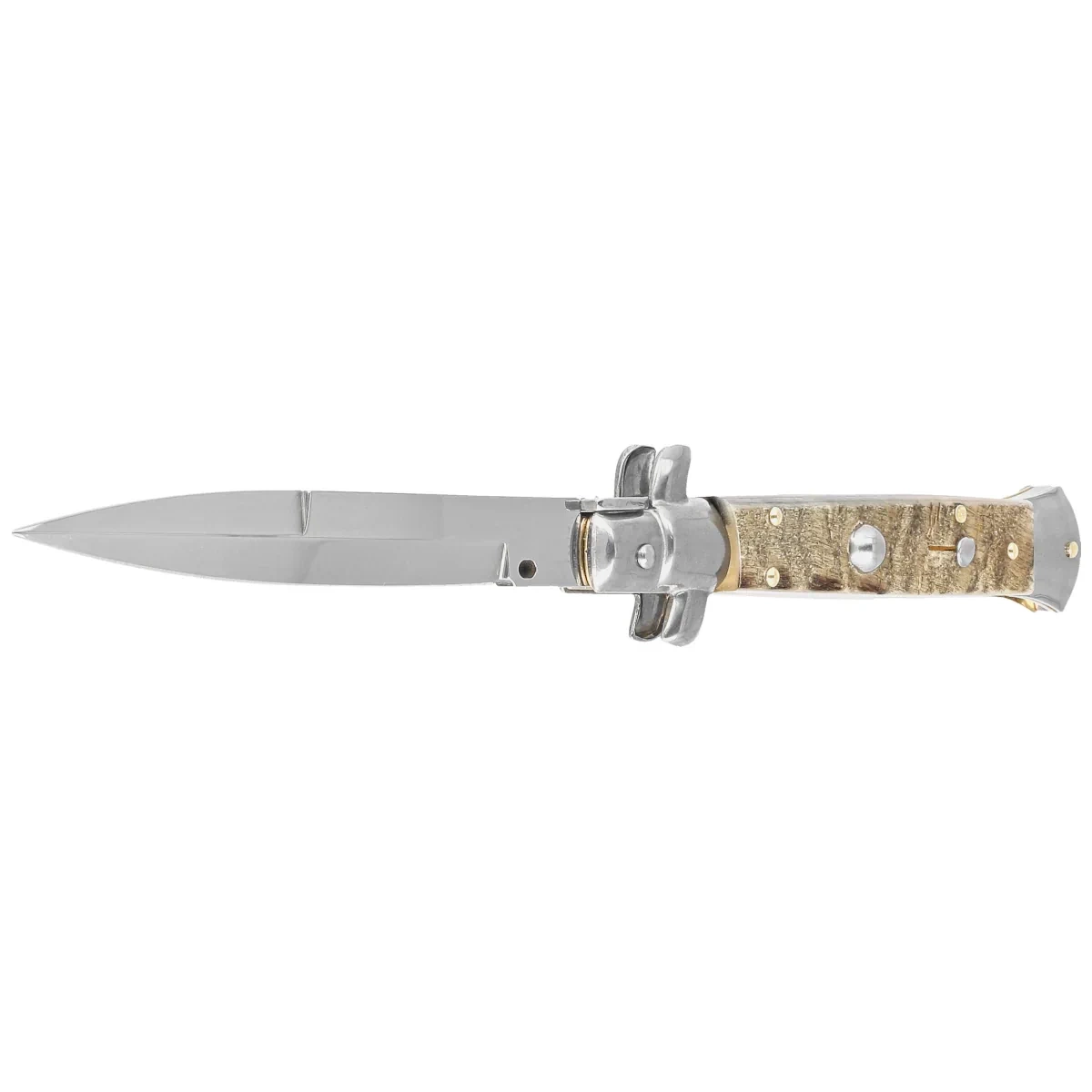 - Italian Stiletto Ram Horn, Bayonet 23cm tradycyjny włoski nóż sprężynowy z okładzinami z rogu barana. Ręcznie wytwarzany zgodnie z zasadami włoskiego rzemiosła, otwarcie ostrza musi odbyć w ciągu kilku setnych sekundy.