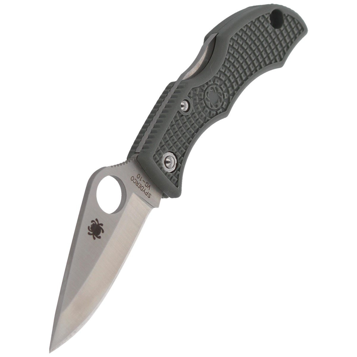 Głownia - o zmodyfikowanym profilu Clip Point, grubości 2 mm, wykonana z japońskiej nierdzewnej stali VG-10 (łatwej do naostrzenia, dobrze trzymającej ostrość). Klinga hartowana w przedziale 59-61 HRC. Powłoka Satin Finish (pół-mat) eliminuje odblaski. Ostrze gładkie Plain wyprowadzono szlifem płaskim (Saber Grind). Okrągłe wycięcie SpyderHole (patent Spyderco) umożliwia otwarcie noża kciukiem. Solidny Back-Lock z wycięciem Boye Detent, zapobiegającym przed przypadkowym zwolnieniem blokady przy mocnym uchwyceniu noża. Karbowana rampa pod kciuk.
