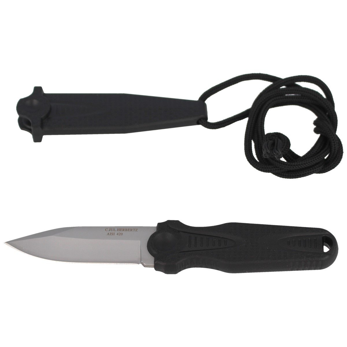 Łatwy w przenoszeniu ze względu na wymiary, płaską konstrukcję oraz ekstremalnie niską wagę 56 g nóż niemieckiej marki Herbertz CJH. Dzięki doskonałej ergonomii dobrze leży w dłoni mimo kompaktowych rozmiarów. Lekki, smukły i niezastąpiony nóż o ostrym przeszywającym ostrzu z płaską pochewką przystosowaną do zawieszania na szyi. Stosowany do samoobrony oraz drobnych prac. Bestseller!