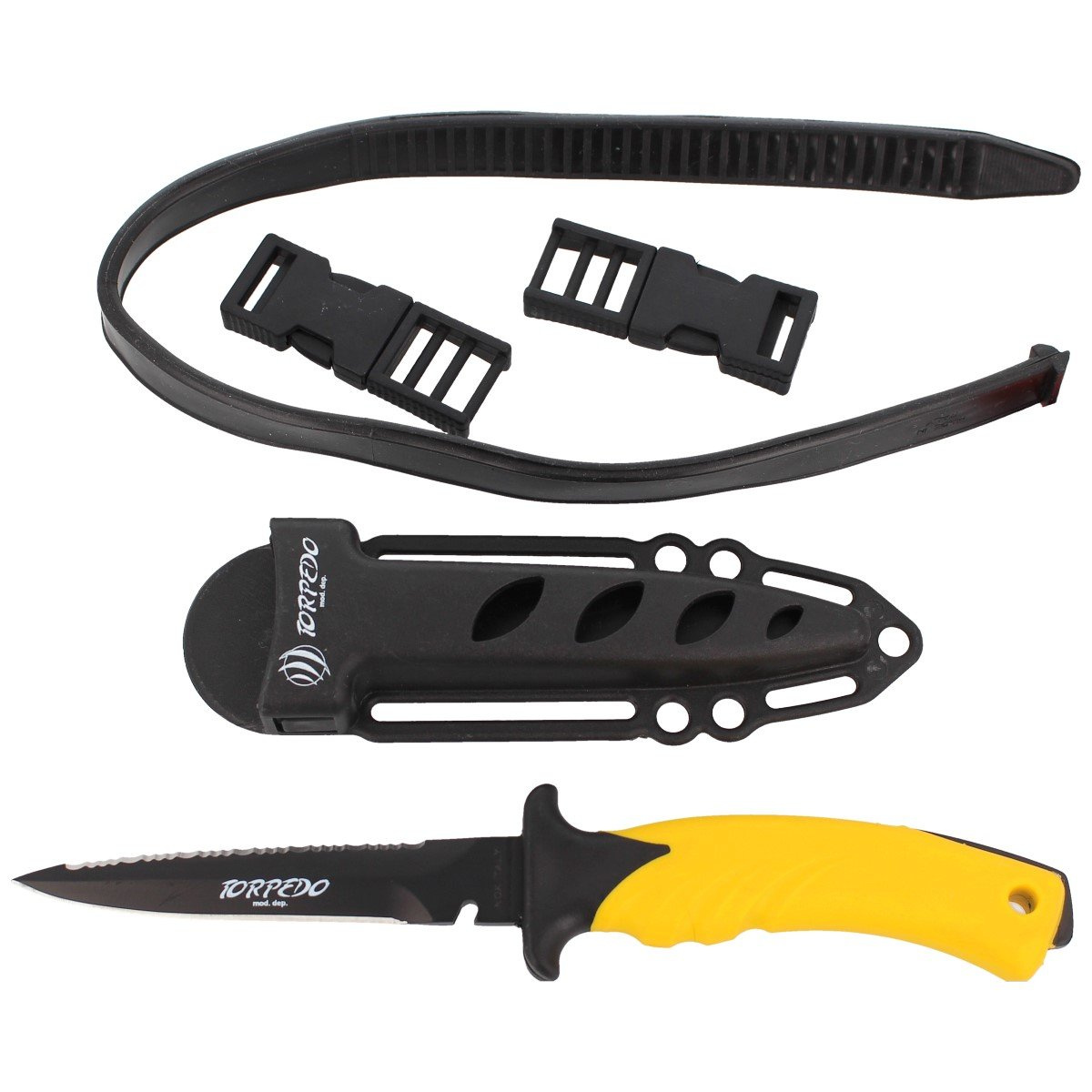 - TORPEDO11 BE YELLOW, doskonały nóż nurkowy (back-up) firmy MAC. Nieodzowny element wyposażenia każdej wyprawy nurkowej. Głownia dagger ze stali nierdzewnej W 1.4116 o dużej odporności na korozję, pokryta nierefleksyjną powłoką IDROGLIDER GOLD® Black.
