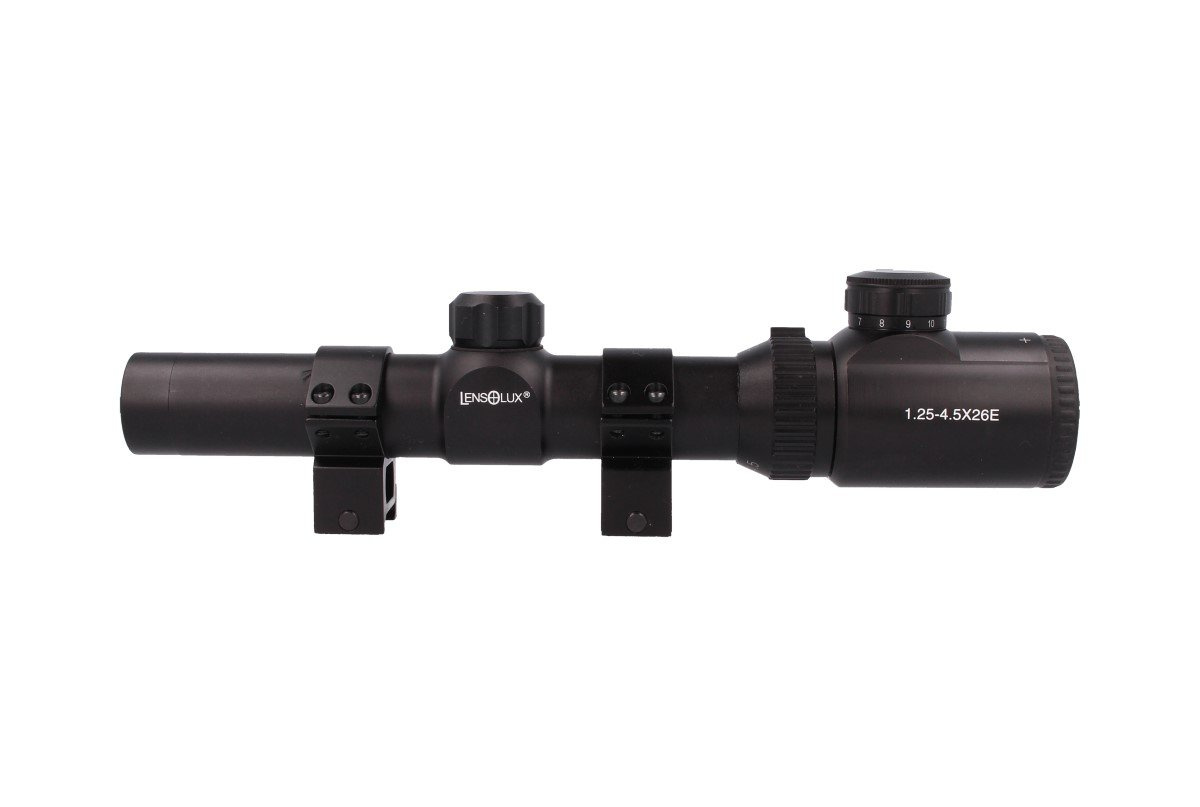 - 19304 luneta celownicza Lensolux. Podświetlany krzyż 4 Red-Dot, zmienne powiększenie 1.25-4.5x, średnica obiektywu 26mm. Siatka w 2-gim planie, stała przy zmianie powiększeń. Ze względu na duże pole widzenia 27m/100m idealny do strzelań do ruchomych celów
