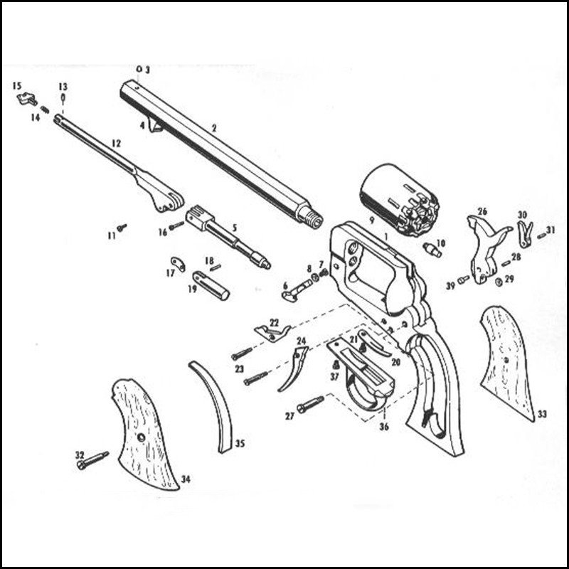 Budowa - mosiężna rama (zamknięty szkielet). Osłona spustu (kabłąk), nasada lufy oraz okucia chwytu wykonane z polerowanego mosiądzu. Sześciostrzałowy bęben oraz oktagonalna lufa o długości 6.5", (skok gwintu 1-30"- oksydowane na kolor czarny. Okładki chwytu wykonane z naturalnego olejowanego drewna orzechowego.
