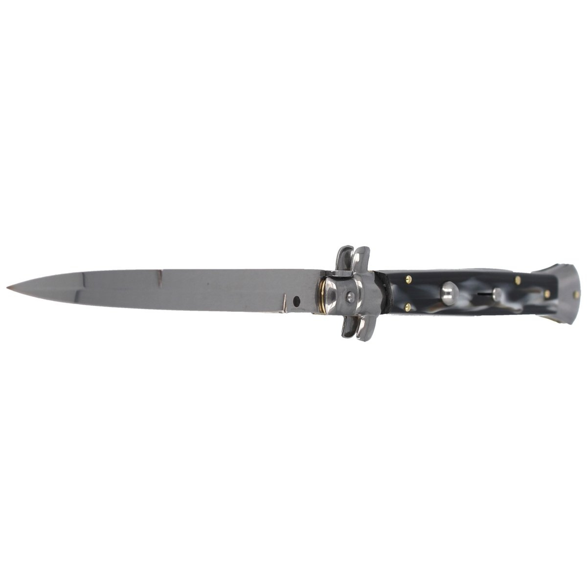 - Frank Beltrame Stiletto Imit. Horn Bayonet 28cm. Kultowy włoski nóż sprężynowy ręcznie składany okładziny imitujące róg bawoła. Folder podczas otwierania klingi setnych sekundy wydaje charakterystyczny klik odróżniający go od pozostałych noży sprężynowych