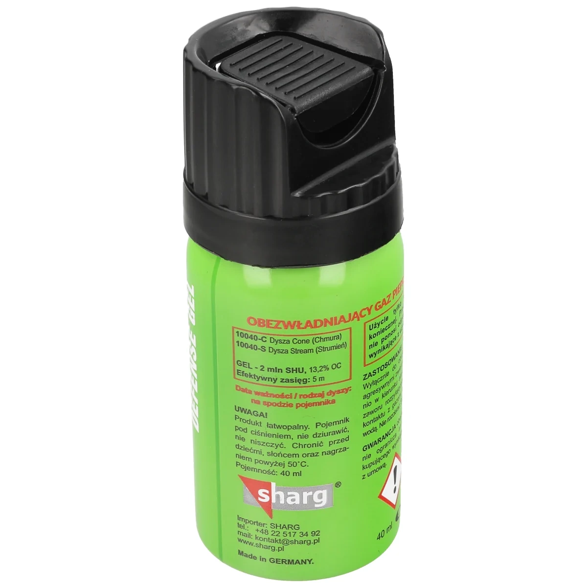 Green Defence Red Pepper Gel 2mln SHU, Cone 40ml. Wyprodukowany w Niemczech, ręczny miotacz gazu pieprzowego w żelu marki Sharg o nowej wzmocnionej formule (2 000 000 SHU, 10% OC). Do obrony przed napastnikiem / grupą napastników, będących również pod wpływem alkoholu lub środków psychoaktywnych. Skład chemiczny skuteczny również do obrony przed agresywnymi zwierzętami. Gaz pieprzowy w żelu wśród użytkowników ma bardzo pozytywne opinie. Pozwala na precyzyjne wycelowanie w agresora, bez ryzyka porażenia siebie lub przypadkowych osób. Dodatkowo można go stosować w pomieszczeniach zamkniętych i w różnych warunkach atmosferycznych — np. w trakcie deszczu lub silnego wiatru.