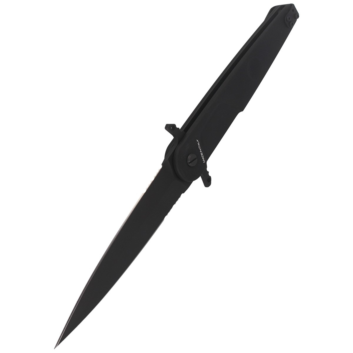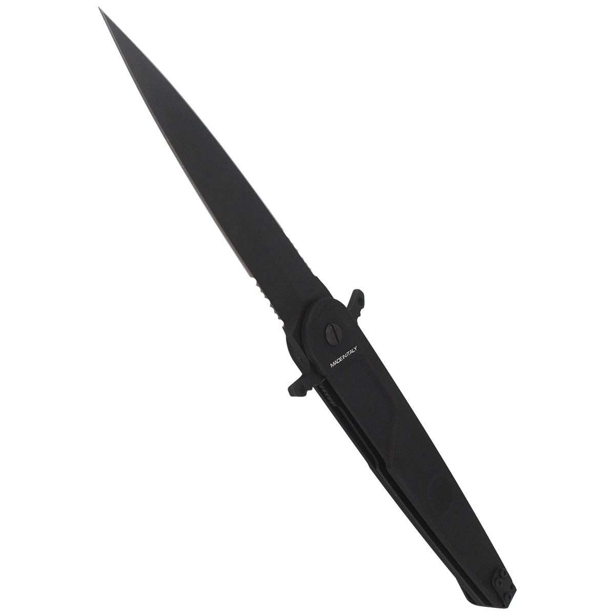 Głownia - smukła i niezwykle ostra o profilu Dagger (sztylet) z obusiecznym symetrycznym ostrzem. Boki klingi z krótką piłą do agresywnego cięcia. Głownia wykonana z dobrze trzymającej ostrość, wytwarzanej w austriackiej hucie Böhler-Uddeholm, wytrzymałej, wysokokobaltowej stali nierdzewnej N690 o twardości 58 HRC. Pokryta matową nierefleksyjną powłoką MIL-C-13924 BURNISHING. Obustronne gładkie ostrze Plain wyprowadzono szlifem płaskim (Flat Grind) który zapewnia wytrzymałość, doskonałą geometrię krawędzi tnącej oraz ekstremalną wydajność cięcia i penetracji. Solidny mechanizm Liner-Lock. Obustronny (double guard) stalowy karbowany jelec chroniący dłoń i służący do szybkiego otwarcia klingi.