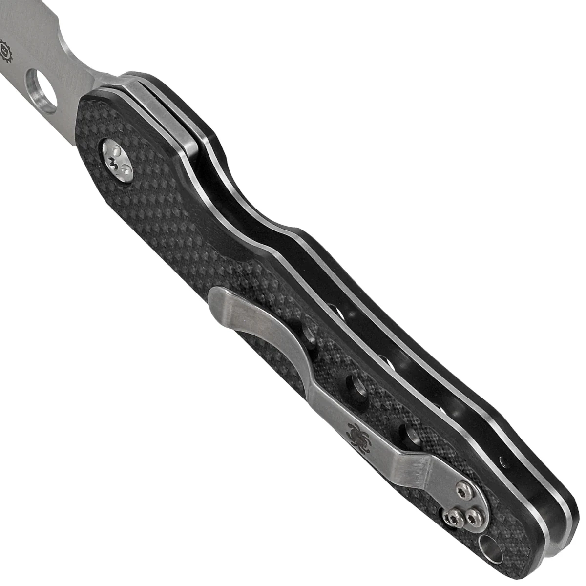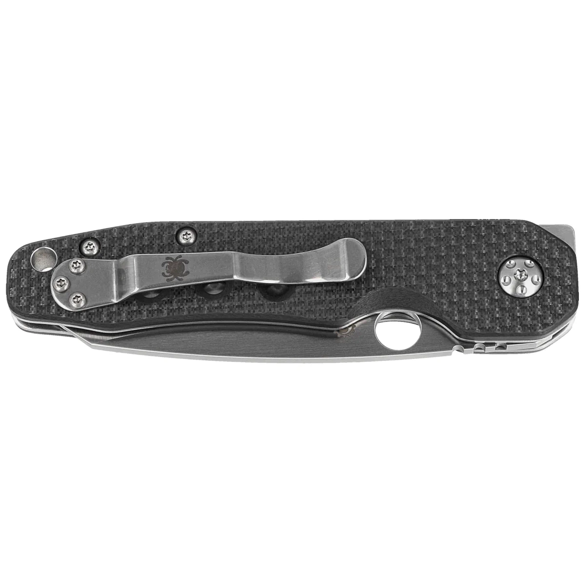 Rękojeść - laminowane okładziny z teksturowanego włókna węglowego / G-10 (carbon fiber / G-10). G-10 wytrzymałe tworzywo, odporne na działanie wysokich i niskich temperatur, środków chemicznych) zapewnia wygodny uchwyt, ergonomiczny opływowy kształt i ekskluzywną teksturę. Wycięcie w jednej z okładzin gwarantuje intuicyjny dostęp do wycięcia SpyderHole. Metalowy jednopozycyjny klips (prawostronny) pozwala przenosić nóż w pozycji tip-up (czubkiem do góry). W tylnej części okładzin otwór (lanyard hole) umożliwiający mocowanie linki.