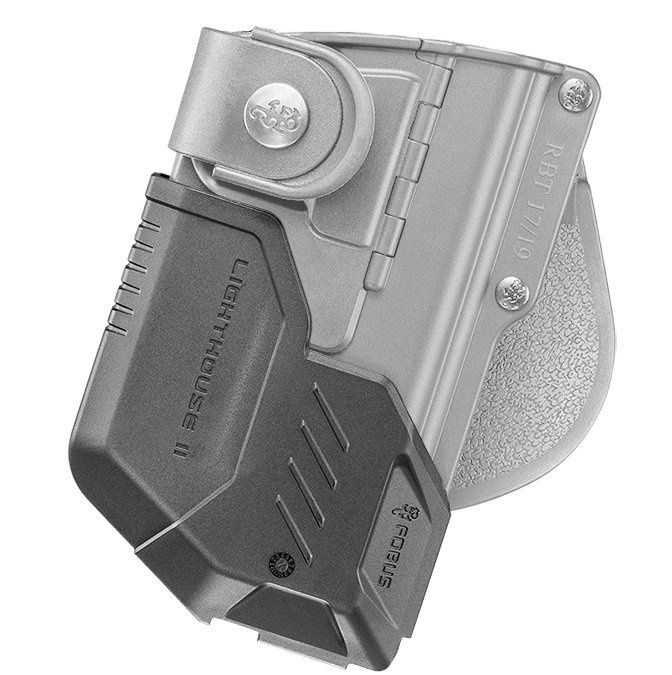 LIGHTHOUSE II, osłona zabezpieczająca na latarkę do pistoletu lub celownik laserowy. Zaprojektowana do kabur Fobus RBT17G oraz RBT19G. Pasuje do latarek i celowników: Inforce APLC, Viridian C5L, Viridian E-series, Lasermax Spartan, Lasermax Uni, Crimson Trace Lightguard, Crimson Trace Rail Master, Surfire XC1, Streamlight TLR i podobne.