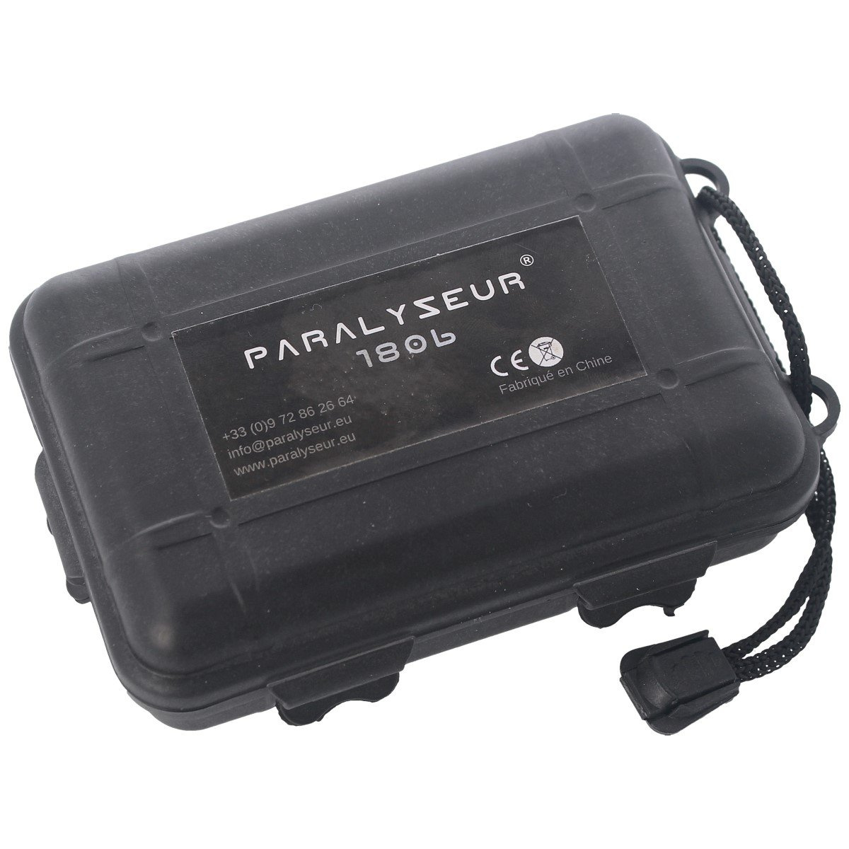Skrzynka survivalowa - paralizator zapakowano w wodoszczelną i pyłoszczelną skrzynkę survivalową wykonaną z twardego polimeru w kolorze czarnym. Wewnątrz skrzynką wypełniono pofalowaną gąbką chroniącą zawartość przed uszkodzeniem. Na jednym z boków pojemnika znajdują się otwory przez które przewieszono linkę zabezpieczającą.