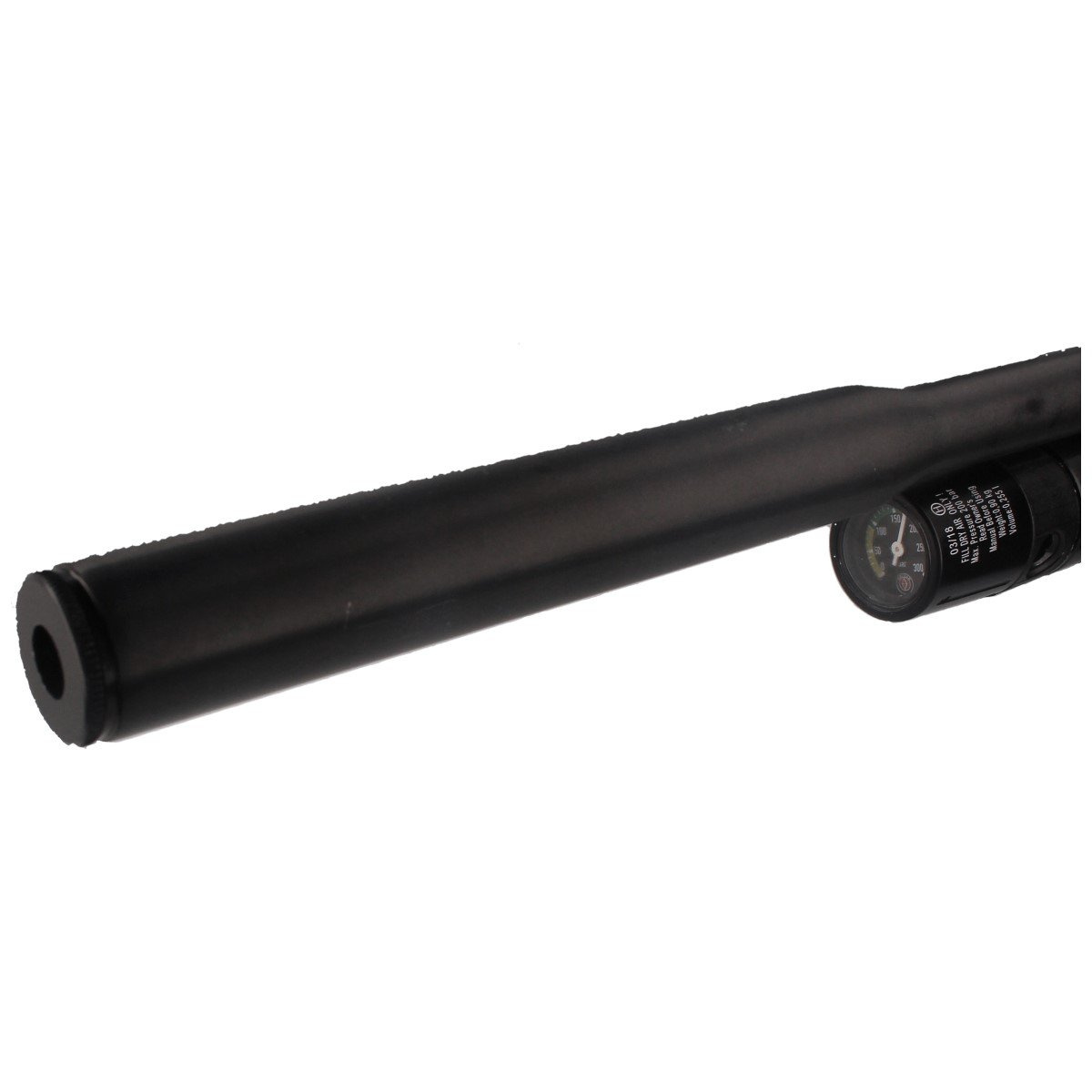 Zasilanie - aluminiowy zbiornik sprężonego powietrza o pojemności 255 cc. W pełni naładowany kartusz pozwala na oddanie 19 efektywnych strzałów (dane dla wersji FAC*). Wbudowany manometr pozwala kontrolować ciśnienie znajdujące się w zbiorniku, a tym samym stopnień jego naładowania. Obrotowy pierścień chroni wlot ładowania przed uszkodzeniem. Po opróżnieniu sprężonego powietrza, pusty zbiornik może zostać zastąpiony nowym napełnionym (opcja). Stanowi to doskonałe rozwiązanie dla osób nie zamierzających zabierać pompki PCP czy butli na strzelnicę. 130 bar minimalne ciśnienie robocze w kartuszu rekomendowane przez producenta do prawidłowego działania wiatrówki.