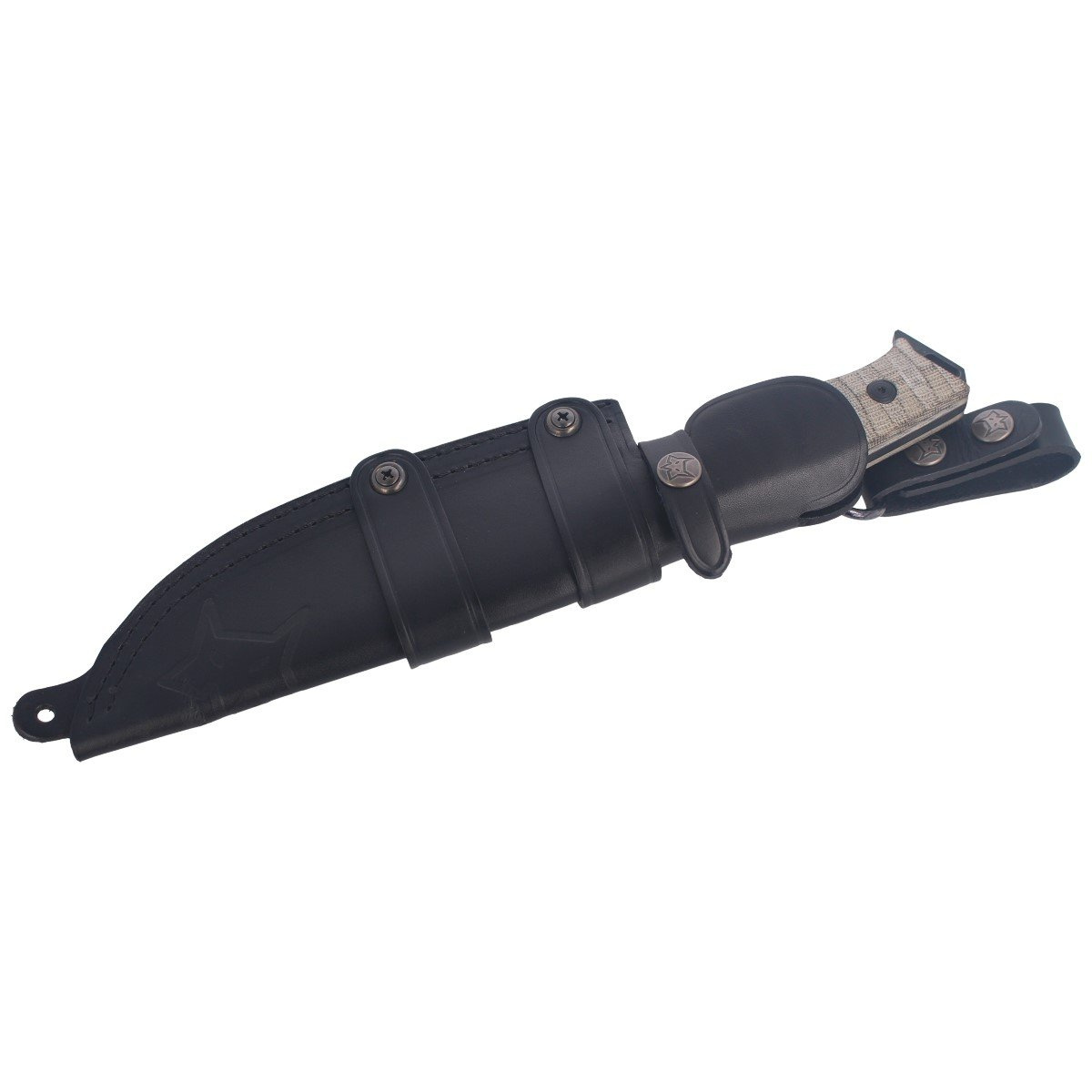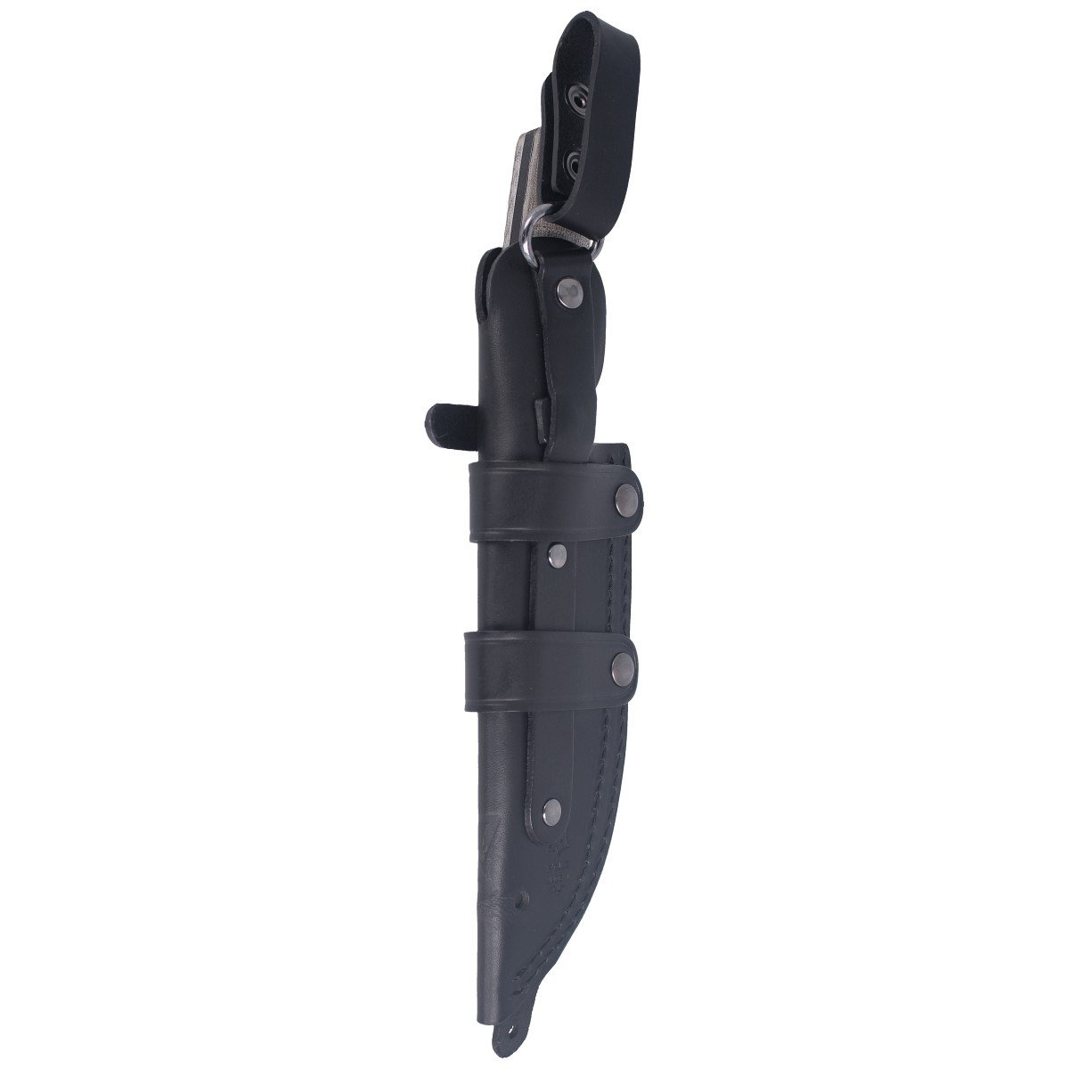Pochwa - przedłużana, chroni głownię wraz z częścią rękojeści. Wykonana ze skóry w kolorze czarnym z tłoczonym logo producenta. Zapinane na zatrzask typu Prym. Mocowane do pasa lub oporządzenia umożliwia przenoszenie noża w pozycji pionowej lub poziomej.