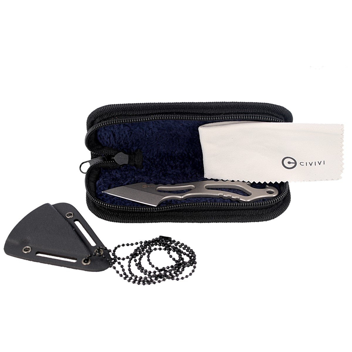 Noże EDC mają rękojeść typu szkieletowego, posiadającą w tylnej części otwieracz do butelek. W komplecie dostajemy czarną pochwę z kydexu którą dzięki dołączonemu czarnemu łańcuszkowi możemy nosić na szyi.