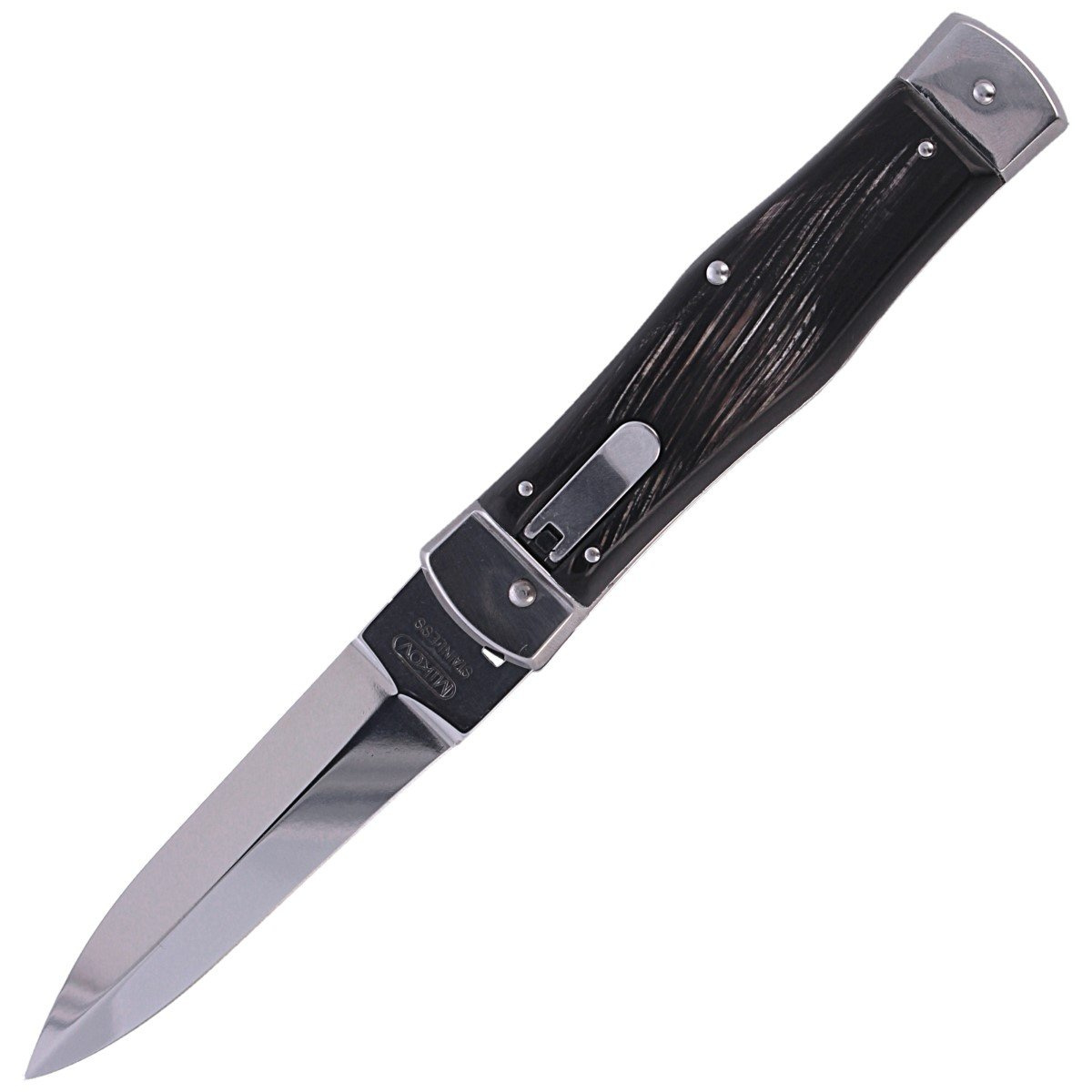 PREDATOR BUFFALO HORN HAMMER, nóż automatyczny (swichblade) czeskiej firmy Mikov z Mikulasovic z okładzinami z rogu bawoła zakończonymi młotkiem. Region ten od 1794 roku specjalizuje się w produkcji wyrobów nożowniczych, będąc nazywanym "czeskim Solingen".