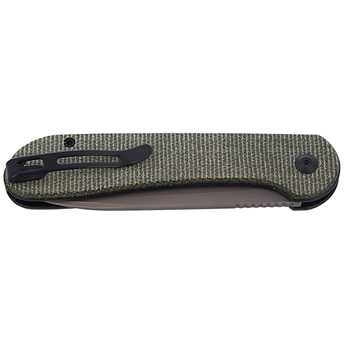 Rękojeść - teksturowane okładki w kolorze ciemnozielonym z micarty, kompozytowego materiału z lnu i żywicy syntetycznej. Całość mocowana do linersów ze stali nierdzewnej. Prosta, solidna konstrukcja daje pewność wieloletniego użytkowania. Ciemnozielony backspacer wykonano z tego samego materiału co okładziny. Oś pivota zdobi stylizowane logo marki Civivi. Metalowy obustronny klips deep carry pozwala przenosić dyskretnie nóż w kieszeni w pozycji tip-up (czubkiem ostrza do góry). Na końcu rękojeści, w zagłębieniu backspacera, lanyard hole, otwór na linkę.
