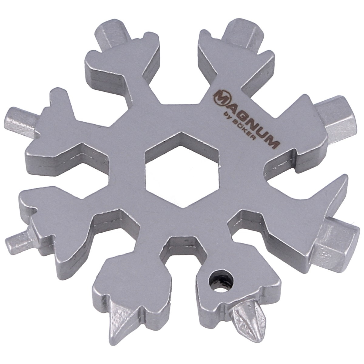 Böker Snow Crystal Tool to poręczne masywne narzędzie wielofunkcyjne przypominające płatek śniegu. Wykonane ze stali 3Cr13 o grubości ponad ośmiu milimetrów łączy w sobie 18 funkcji na bardzo małej powierzchni. Dzięki kluczom imbusowym, kluczom nasadowym, śrubokrętom, otwieraczowi do butelek i ściągaczowi izolacji, nie ma rzeczy, której byś nie był w stanie wykonać - to jak mini skrzynka z narzędziami w Twojej kieszeni!