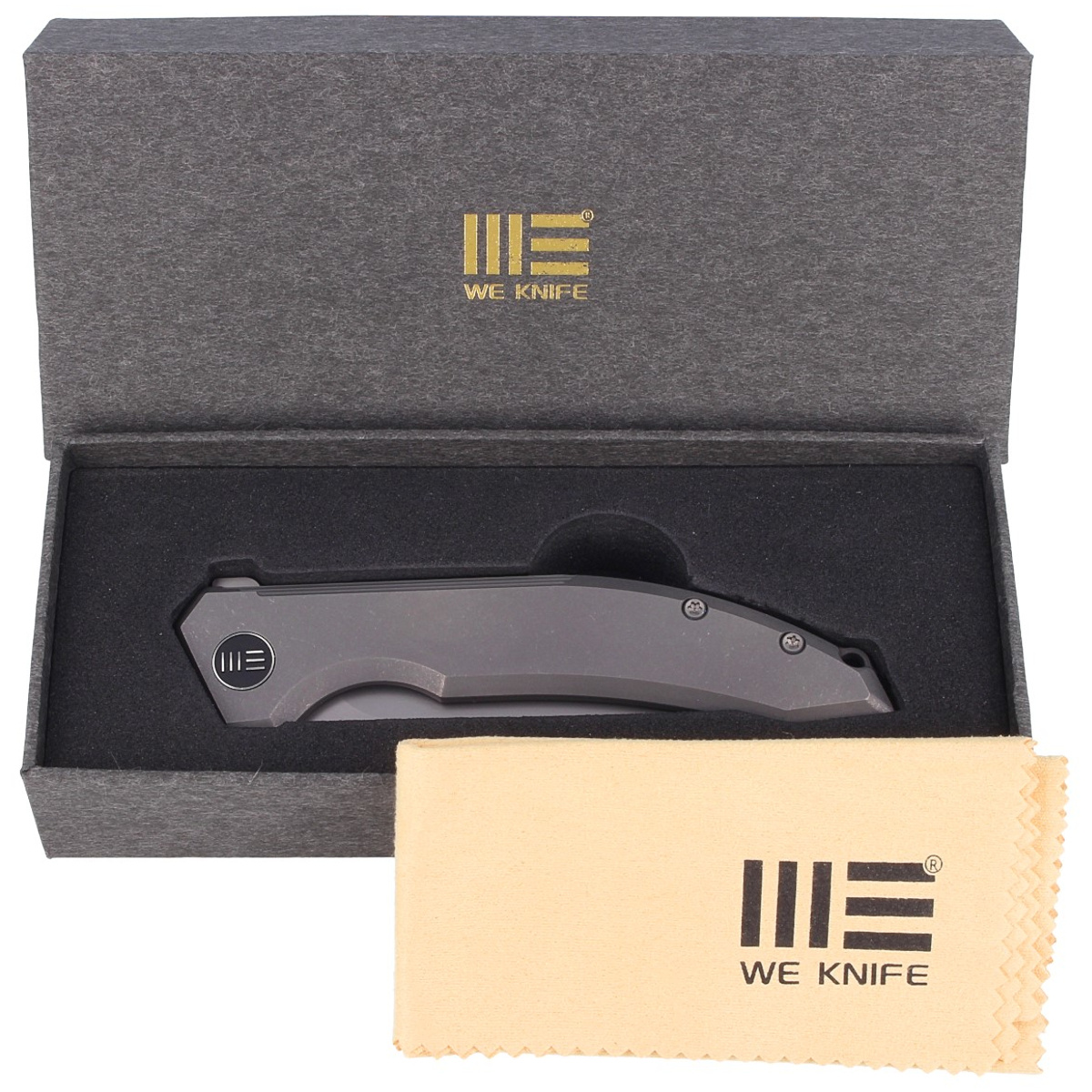 Z tytanu 6AL4V, fazowane krawędzie okładek eliminują ostre krawędzie, a wykonane z przodu podcięcie na palec (fore finger groove) poprawia pewność uchwytu. Okładziny przykręcono do misternie obrobionego tytanowego backspacera, dając pewność wieloletniego użytkowania. Oś pivota zdobi stylizowane logo marki WE Knife. Jednopozycyjny (prawa) tytanowy klips deep carry pozwala przenosić dyskretnie nóż w kieszeni w pozycji tip-up (czubkiem ostrza do góry). Nad klipsem lanyard hole, otwór do przewleczenia linki zabezpieczającej lub ozdobnej.
