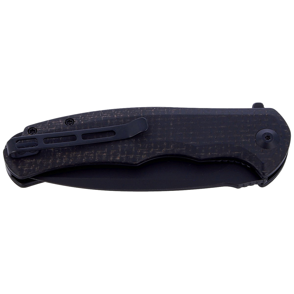 Rękojeść - szorstkie okładziny z czarnej micary (płótna prasowanego pod ciśnieniem z żywicą syntetyczną), które zostały przykręcone do stalowych linersów. Fazowane krawędzie okładek eliminują ostre krawędzie, a wykonane z przodu podcięcia na palce (fore finger groove) poprawiają pewność uchwytu. W praktyce oznacza to wiele lat użytkowania bez osłabienia konstrukcji. Dwupozycyjny klips typu deep carry dla prawo i leworęcznych umożliwia przenoszenie noża w pozycji tip-up (czubkiem ostrza do góry). Nad klipsem lanyard hole, powiększony otwór na linkę zabezpieczającą.