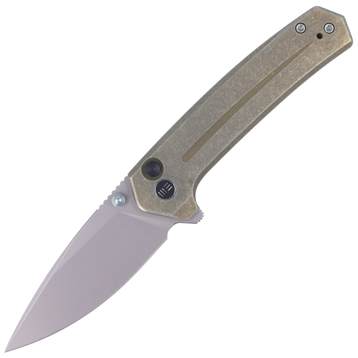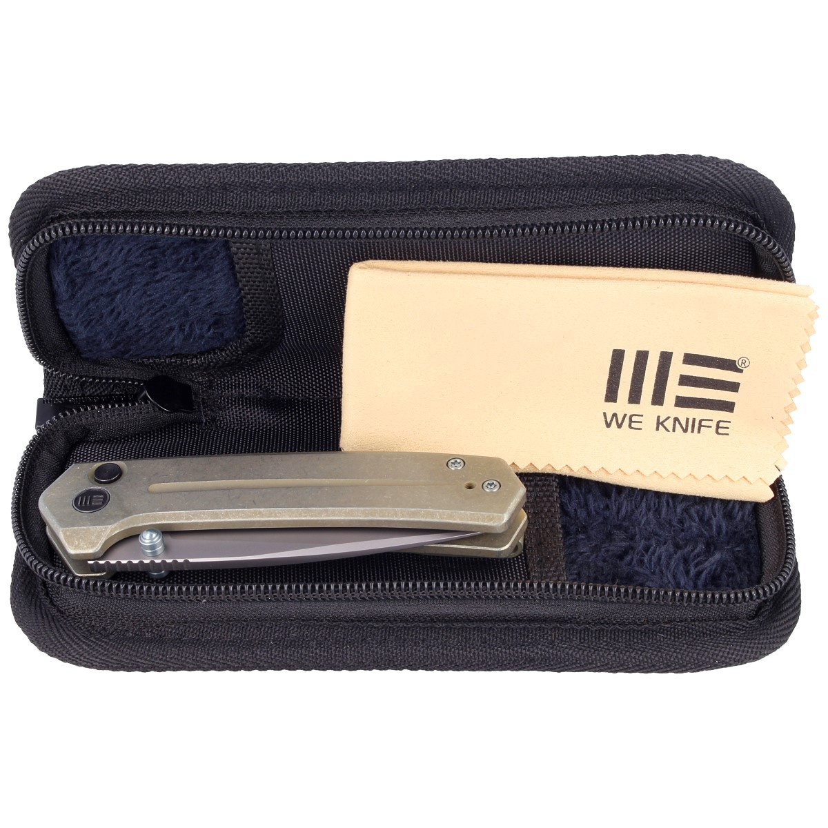 Dwa kawałki litego tytanu 6AL4V w kolorze zielonym. Fazowane krawędzie okładek eliminują ostre ranty dla wygody i poprawiają pewność uchwytu. Otwarta konstrukcja tzw. open-backed mocowana stalowymi tulejami dystansowymi redukuję wagę oraz ułatwia czyszczenie. Podobnie jak w innych modelach WE, oś pivota zdobi stylizowane logo producenta. Lewo/prawostronny tytanowy klips umożliwia przenoszenie noża w pozycji tip-up, czubkiem ostrza ku górze.