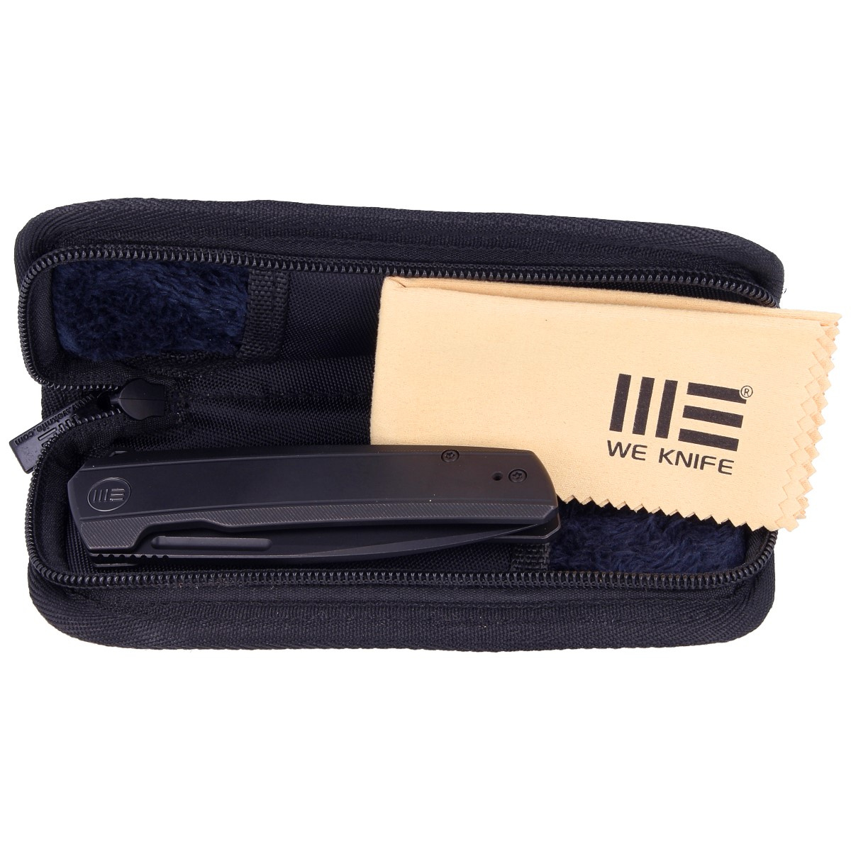 Dwa kawałki litego tytanu 6AL4V w kolorze czarnym. Fazowane krawędzie oraz drobna tekstura poprawiają pewność uchwytu. Otwarta konstrukcja tzw. open-backed mocowana tytanowymi tulejami dystansowymi redukuję wagę oraz ułatwia czyszczenie. Podobnie jak w innych modelach WE, oś pivota zdobi stylizowane logo producenta. Lewo/prawostronny tytanowy klips umożliwia przenoszenie noża w pozycji tip-up, czubkiem ostrza ku górze.