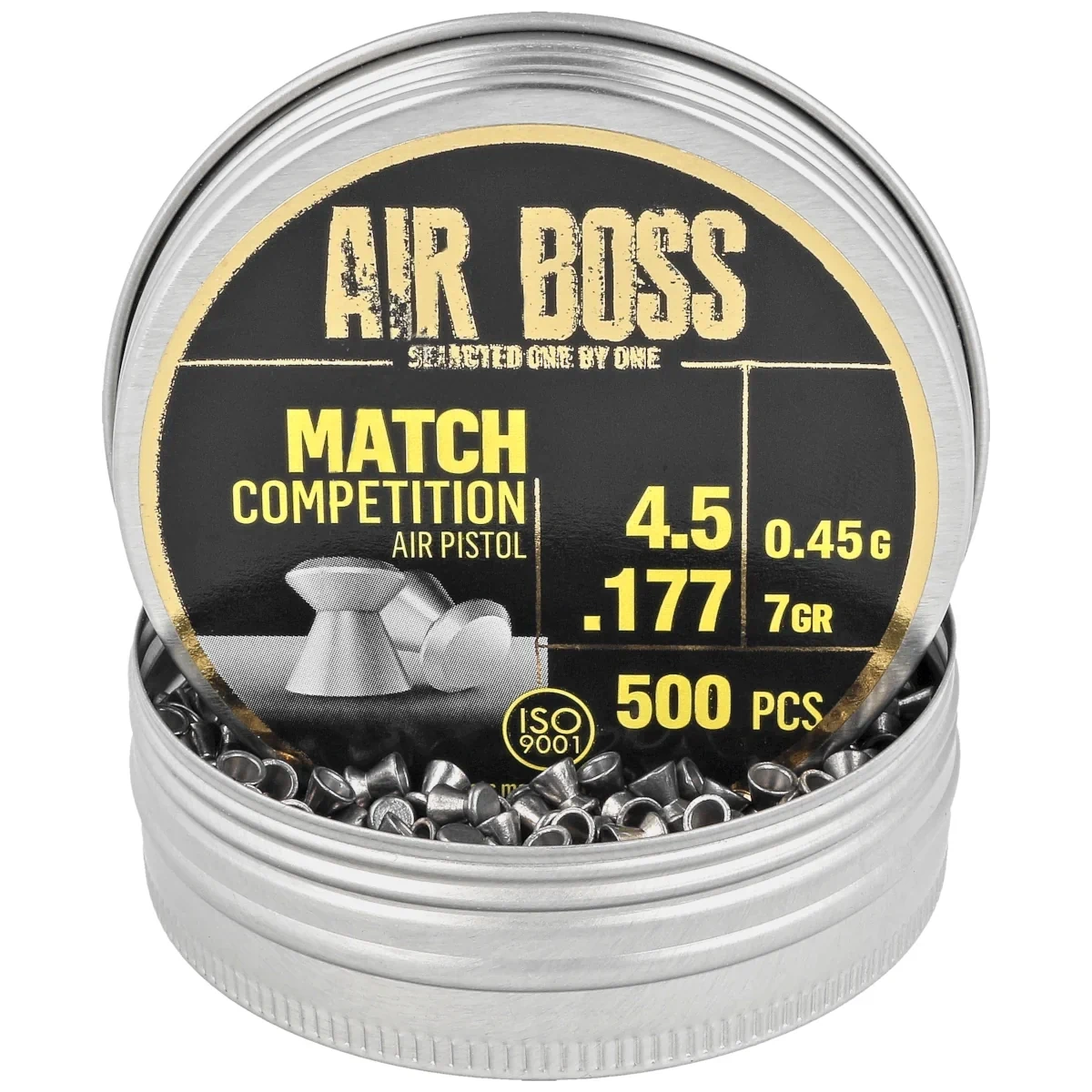 - Air Boss Match Competition Air Pistol 4.5mm ręcznie sortowany zawodniczy pistoletowy śrut tarczowy z płaskim czołem. Dzięki dobranej wadze idealny do sportowych pistoletów pneumatycznych ale wiemy, że również nadaję się do karabinów pneumatycznych. 500szt