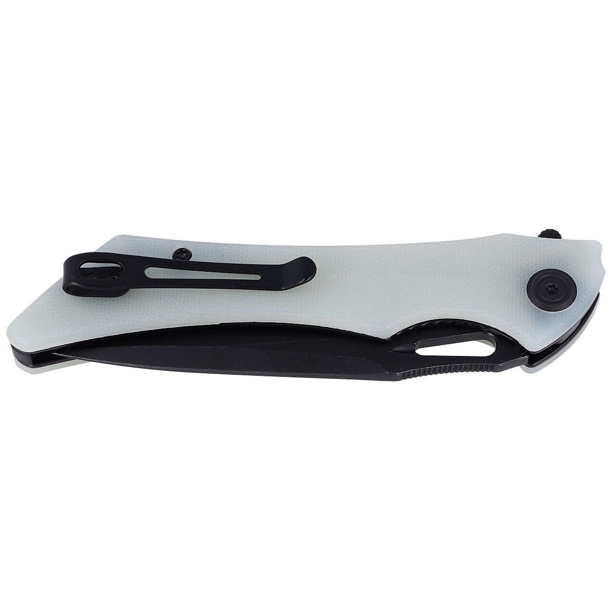 Rękojeść - okładziny wykonane z jadeitowego G10 (materiału znanego z wysokiej wytrzymałości, lekkości, odporności na wilgoć i trwałości) z teksturą dla poprawienia pewności uchwytu, przykręcono do stalowej ramy noża. Całość skręcona do solidnego backspacera, również wykonanego z G10. Prosta, solidna konstrukcja daje pewność wieloletniego użytkowania. Głębokie podcięcie na palec (fore finger groove) poprawia pewność uchwytu. Oś pivota zdobi stylizowana śruba. Dwupozycyjny (prawo i lewostronny) tytanowy klips deep carry pozwala przenosić dyskretnie nóż w kieszeni w pozycji tip-up (czubkiem ostrza do góry).