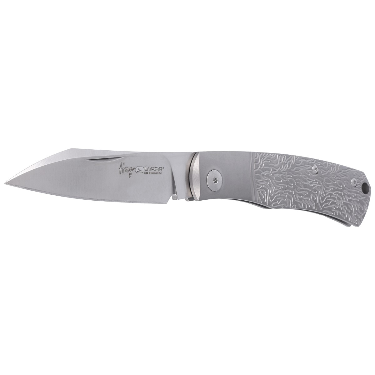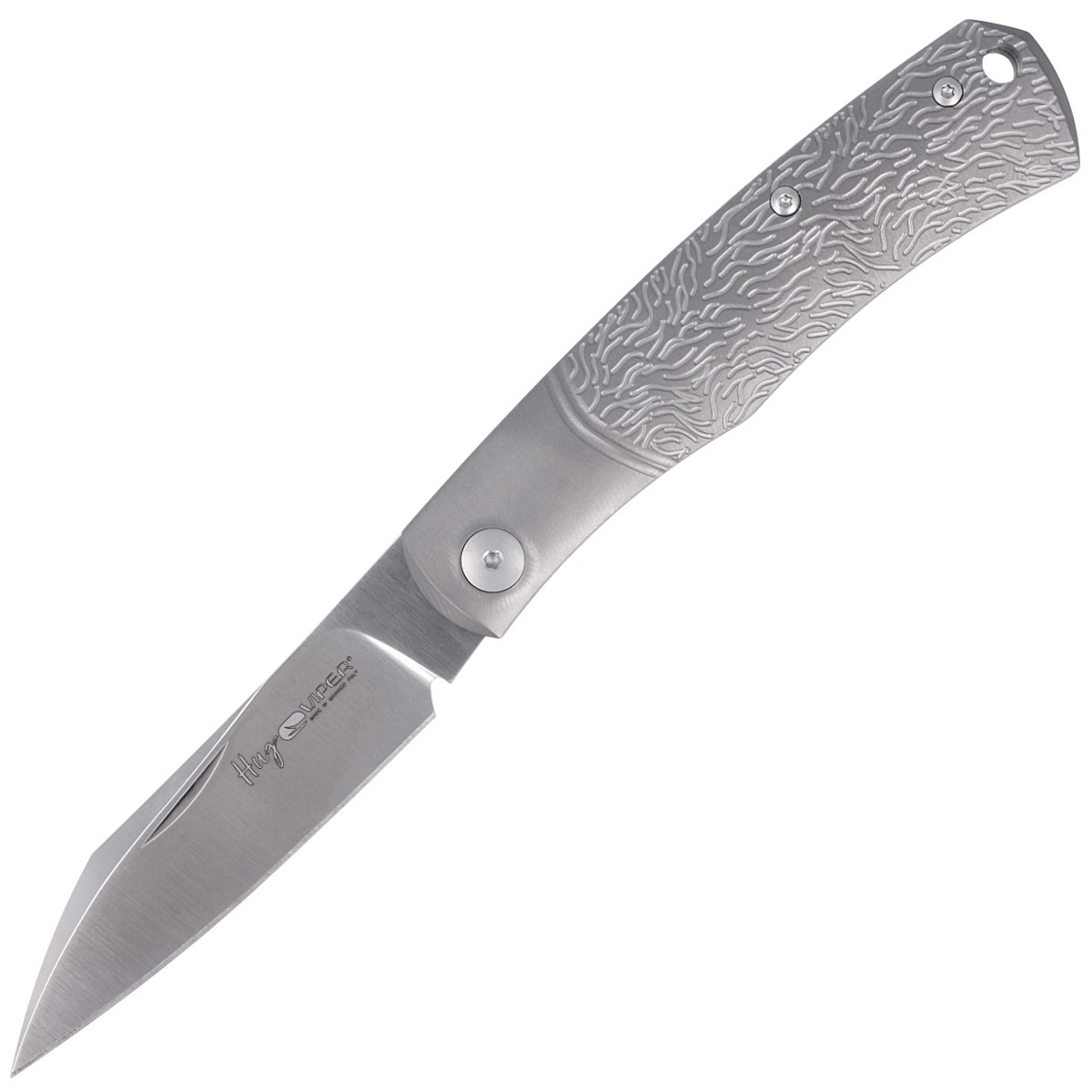 - Hug Gray Titanium Wolf, Satin lekki folder wyposażony w mechanizm SlipJoint. Projekt francuskiego twórcy noży customowych Sachy Thiel'a. Smukłę rękojeści z wzorem wilczego futra i nadające agresywny wygląd i funkcjonalność zmodyfikowane ostrze Wharncliffe