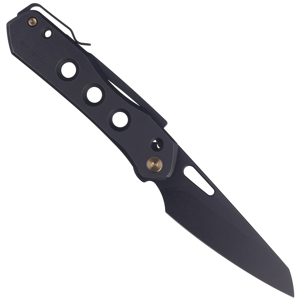 Głownia - typu Reverse Tanto wykończona maskującą rysy metodą Black Stonewashed. Otwierana za pomocą podłużnego otworu w klindze (Thumb Hole), dzięki czemu mogą z niego bez problemu korzystać osoby prawo i leworęczne. Za gładką pracę mechanizmu otwierającego odpowiadają ceramiczne łożyska kulkowe. Niewielka grubość klingi w połączeniu z wysokim, płaskim szlifem (Flat Grind) daje doskonałą geometrię krawędzi tnącej oraz ekstremalną wydajność cięcia. Całość blokowana jest autorską blokadą Snecx'a, Superlock.
