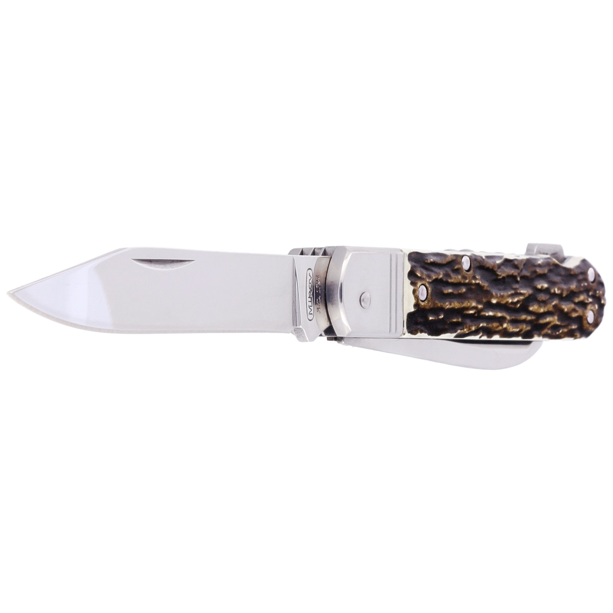 Fixir Imit. Dear Stag, Mirror doskonały scyzoryk myśliwski. 4 ostrza, 4 funkcje. Solidna, wytrzymała konstrukcja, okładziny z imitacji rogu jelenia, mocna blokada głównego ostrza. Piła, ostrze do skórowania i korkociąg. Uniwersalne narzędzie dla myśliwego. Mikulasovice to region, który od 1794 roku specjalizuje się w produkcji wyrobów nożowniczych, będąc nazywanym "czeskim Solingen".