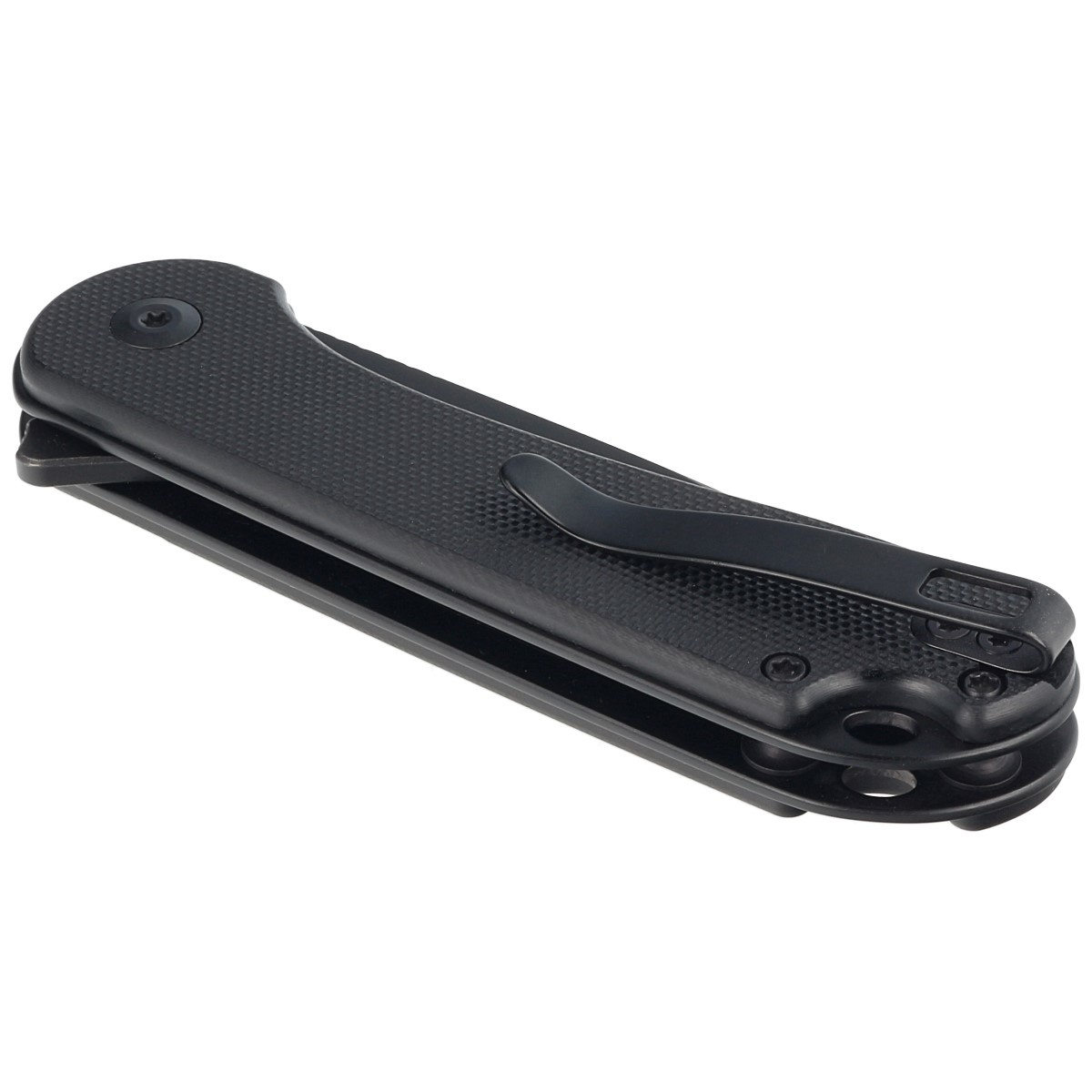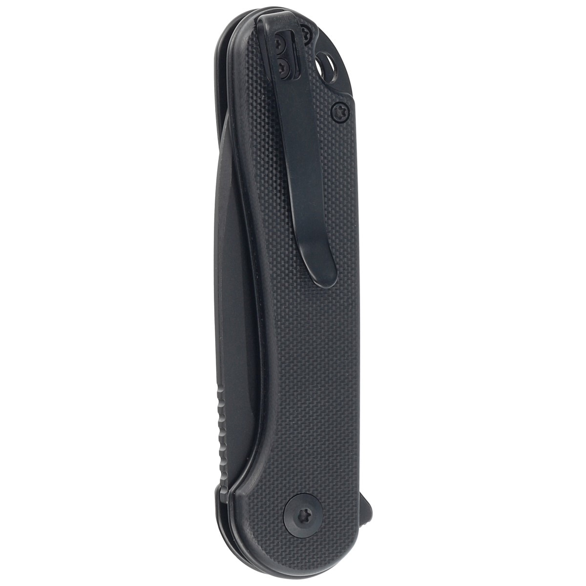 Rękojeść - teksturowane okładki w czarnym kolorze z G10, kompozytowego materiału z włókna szklanego i żywicy syntetycznej. Całość mocowana do linersów ze stali nierdzewnej. Prosta, solidna konstrukcja daje pewność wieloletniego użytkowania. Otwarta konstrukcja tzw. open-backed mocowana stalowymi tulejami dystansowymi redukuję wagę oraz ułatwia czyszczenie. Oś pivota zdobi stylizowane logo marki Civivi. Metalowy jednostronny (prawa) klips deep carry pozwala przenosić dyskretnie nóż w kieszeni w pozycji tip-up (czubkiem ostrza do góry).