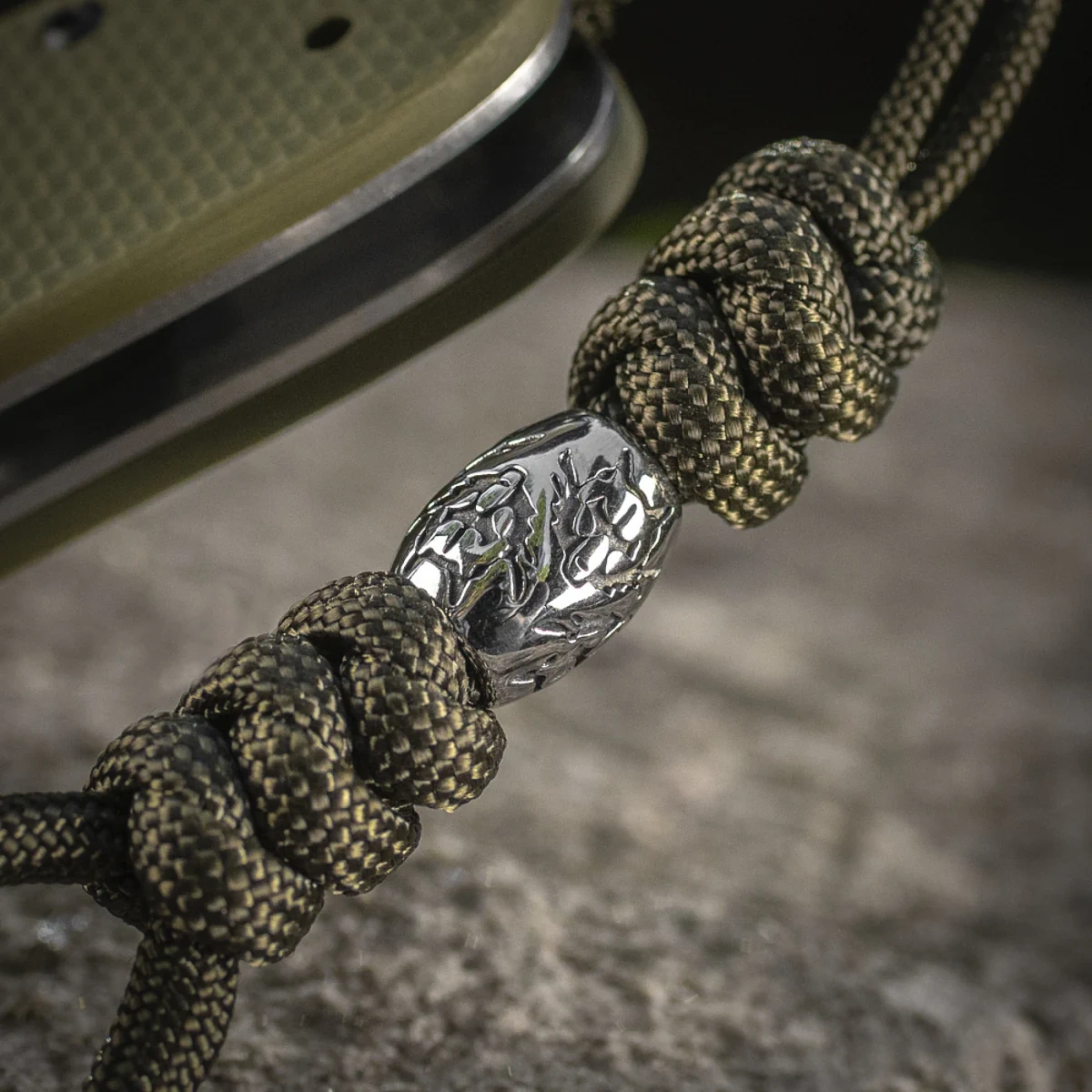 • M-Tac Zeus Olive, przywieszka do noża, latarki, breloka, wykonana z paracordu, zakończona metalowym koralikiem z greckim wzorem. Oprócz walorów estetycznych, przedłuża rękojeść noża ułatwiając wyciągnięcie go z kieszeni.