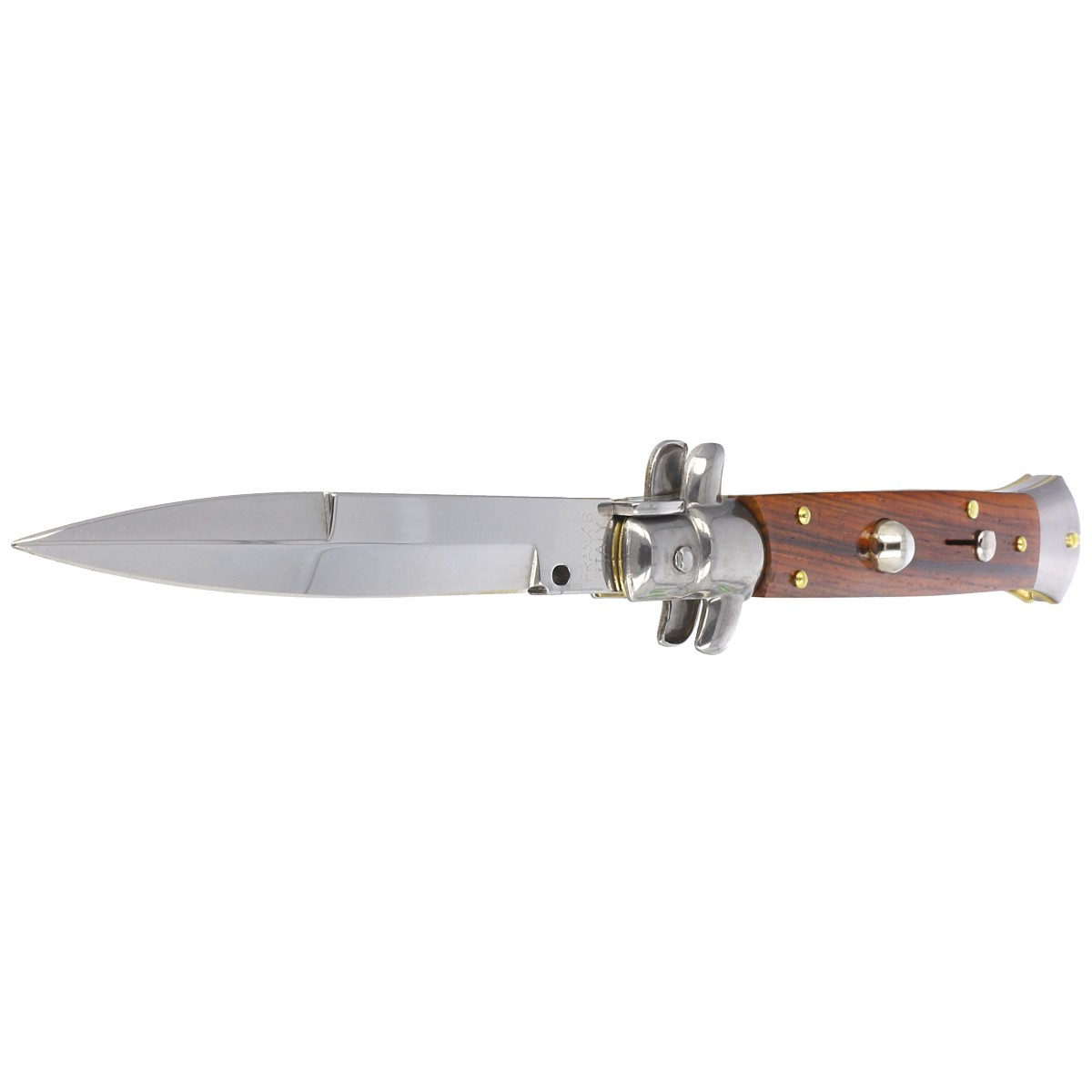 Classic Italian Stiletto Cocobolo Wood Bayonet 23 cm, tradycyjny włoski nóż sprężynowy. Całkowicie ręcznie wykonane zgodnie z zasadami włoskiego rzemiosła, noże Frank Beltrame Stiletto stały się sławne na całym świecie dzięki swej skrajnej lekkości i wytrzymałości. Dzięki swoim właściwościom, włoski sztylet jest odpowiedni do zastosowania w każdym środowisku, od polowania do biwakowania. Solidna, wytrzymała konstrukcja, mocna otwierająca głownię sprężyna, to cecha klasycznych włoskich noży sprężynowych Frank Beltrame.