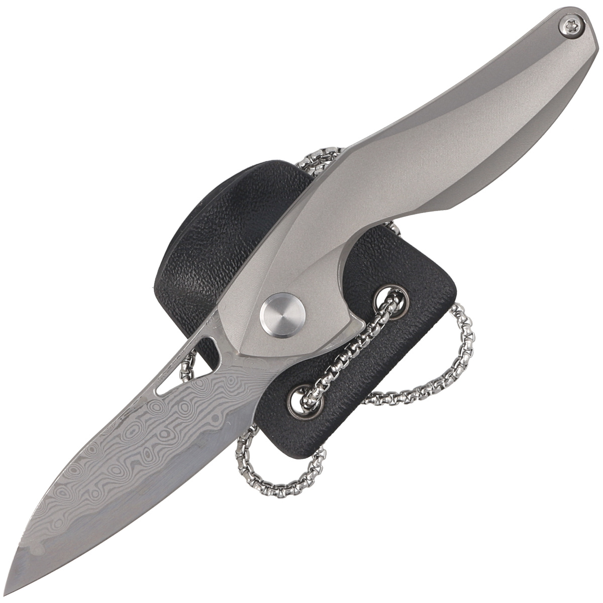 The Reticulan Grey Titanium, Damascus, nieduży, elegancki nóż składany z pochwą przystosowaną do zawieszania na szyi. Projekt znanego knifemakera i designera Elijah Ishama. Wygląd The Reticulan wyraźnie podkreśla styl projektowania Elijah Ishama. Jego projekty są często wzbogacone o artystyczne organiczne kształty i faliste linie. Bez wątpienia The Reticulan to niezwykły nóż, który wyróżni Cię z tłumu!