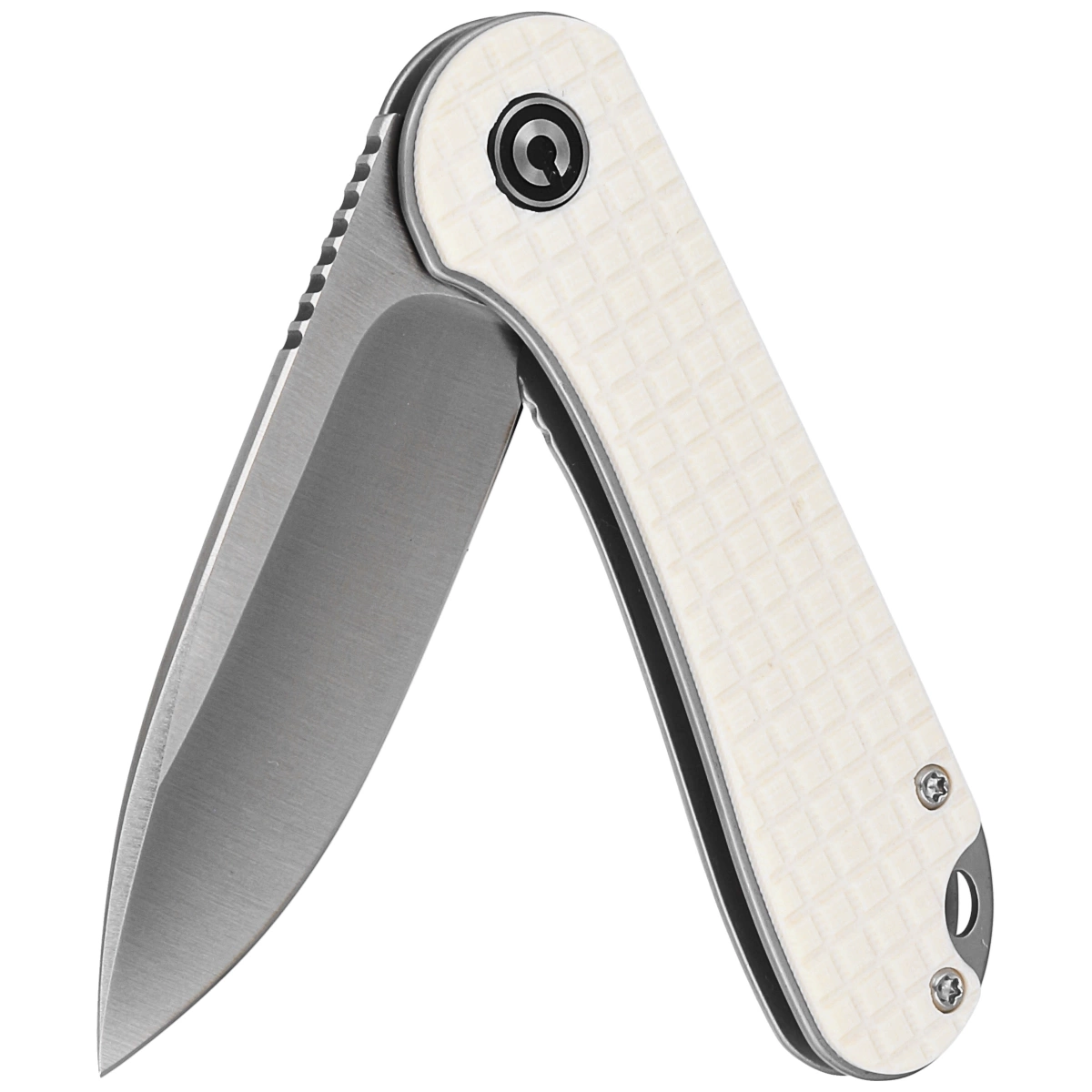 Rękojeść - okładziny z białegotworzywa G10, teksturowane w misterny wzór "kostki 3D" dla poprawienia pewności uchwytu. Całość mocowana do stalowych linersów. W praktyce oznacza to wiele lat pracy bez osłabienia konstrukcji. Otwarta konstrukcja tzw. open-backed bez typowego backspacera, mocowana do siebie stalowymi tulejami dystansowymi ułatwia czyszczenie w terenie. Oś pivota zdobi stylizowane logo marki Civivi. Prawostronny metalowy klips deep carry pozwala przenosić dyskretnie nóż w kieszeni w pozycji tip-up (ostrzem do góry). Nad klipsem lanyard hole, owalny otwór na linkę.