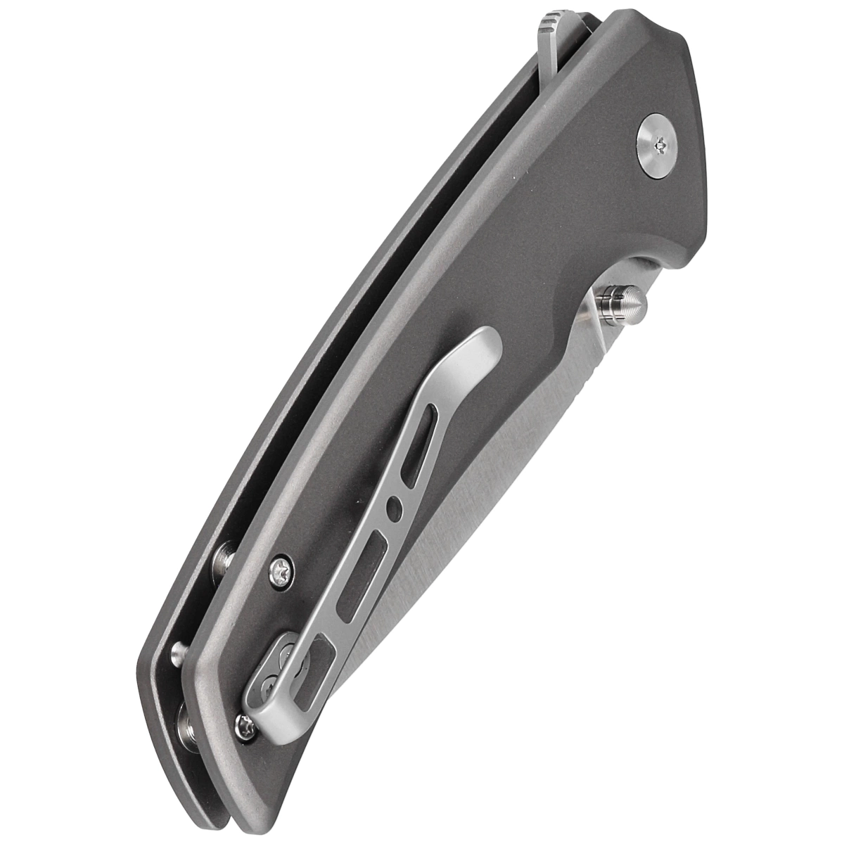 Serene Gray Aluminium, Satin doskonały folder EDC. Głownia Drop Point ze stali narzędziowej D2 otwierana grawitacyjnie, kołkiem w klindze lub flipperem. Okładziny z aluminium. Doskonały towarzysz codziennych wędrówek! Bestseller!