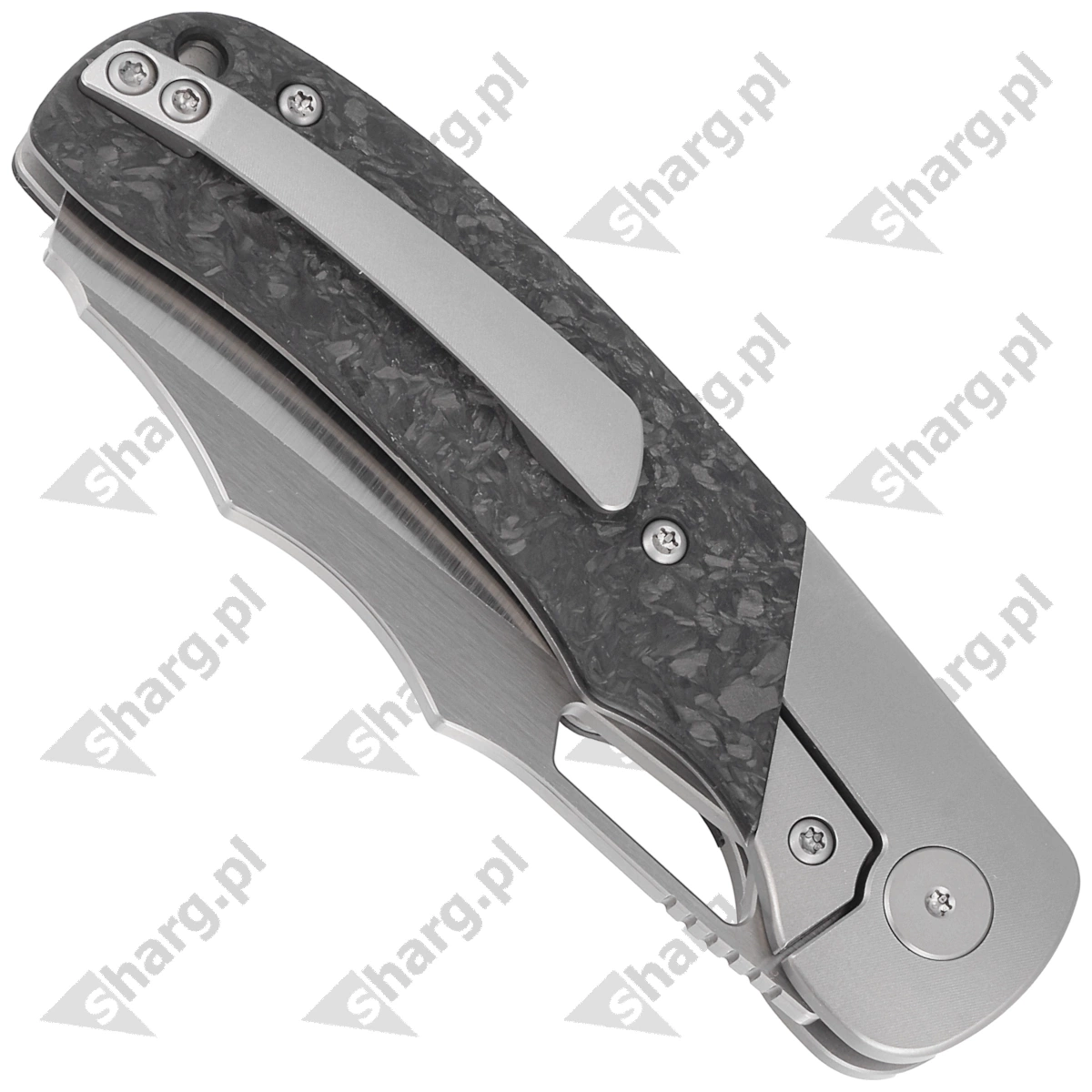 Rękojeść - okładziny z Marble Carbon Fiber, praktycznie niezniszczalnego tworzywa niewrażliwego na warunki atmosferyczne, odpornego na chemikalia i uszkodzenia mechaniczne i tytanowymi bolsterami.  Tytanowy backspacer do którego przymocowano okładziny, gwarantuje sztywność i wytrzymałość całej konstrukcji. Jednopozycyjny, prawostronny tytanowy klips umożliwia przenoszenie noża w pozycji tip-up, czubkiem ostrza ku górze. Nad klipsem otwór do przewleczenia linki zabezpieczającej lub ozdobnej.