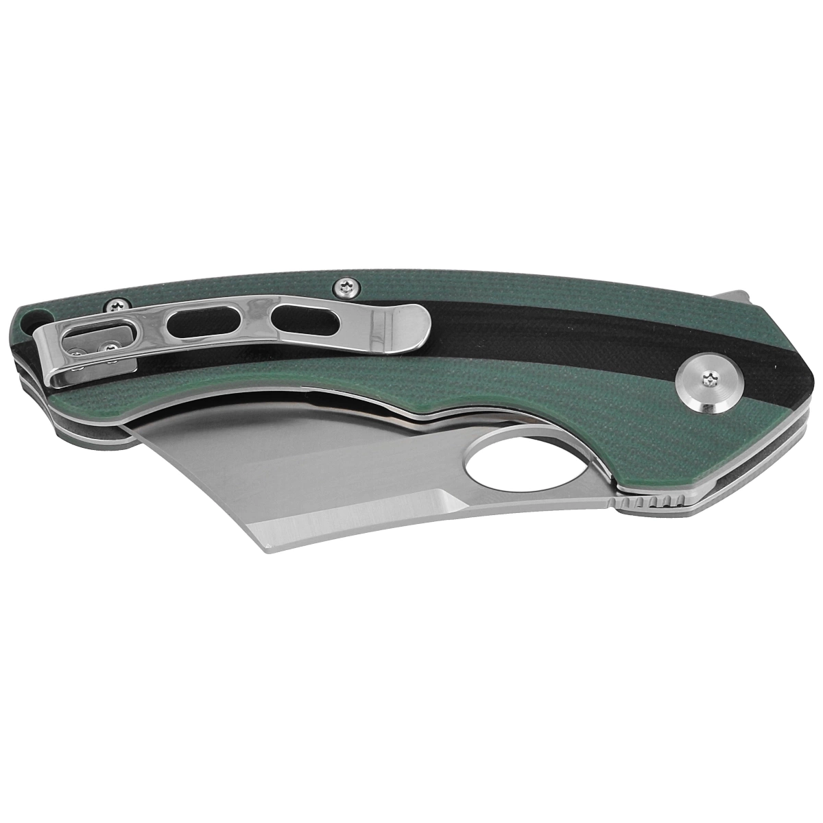 Głownia - szerokatypu Cleaver (tasak) wykończona efektownie metodą Satin. Prosta krawędź tnąca zbiega się w kierunku ostrego czubka noża. Grubość klingi zapewnia wysoką wytrzymałość podczas gdy wysoki, płaski szlif daje doskonałą geometrię krawędzi tnącej oraz ekstremalną wydajność cięcia. Ceramiczne łożyska kulkowe wspomagają otwarcie ostrza za pomocą szybkiej płetwy flippera (index-finger flipper). Nóż możemy również otworzyć przy pomocy owalnego otworu w klindze (thumb hole). Fragment grzbietu klingi pokryto upper jimping, karbowanym oparciem pod kciuk ułatwiającym kontrolę nad nożem. Całość blokowana jest sprawdzoną i popularną blokadą liner lock.